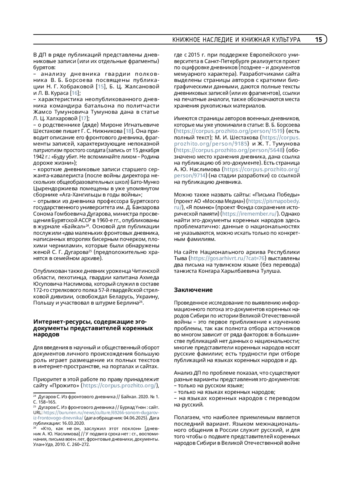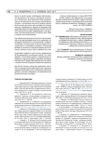 14. Мандринина Л. А. Великая Отечественная война в дневниковых записях сибиряков: анализ корпуса эго-документов // Труды ГПНТБ СО РАН. 2024. № 2. С. 9-17. https://doi.org/10.20913/2618-7515-2024-2-9-17