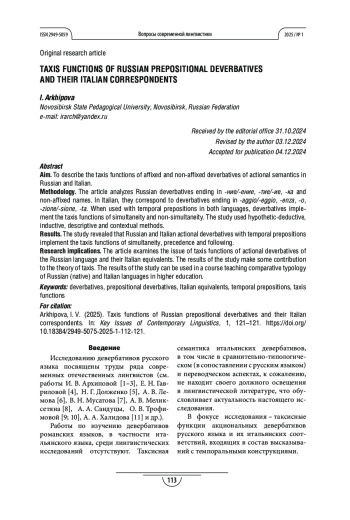 Результаты. Выявлено, что русские и итальянские акциональные девербативы с темпоральными предлогами реализуют таксисные функции одновременности, предшествования и следования.
