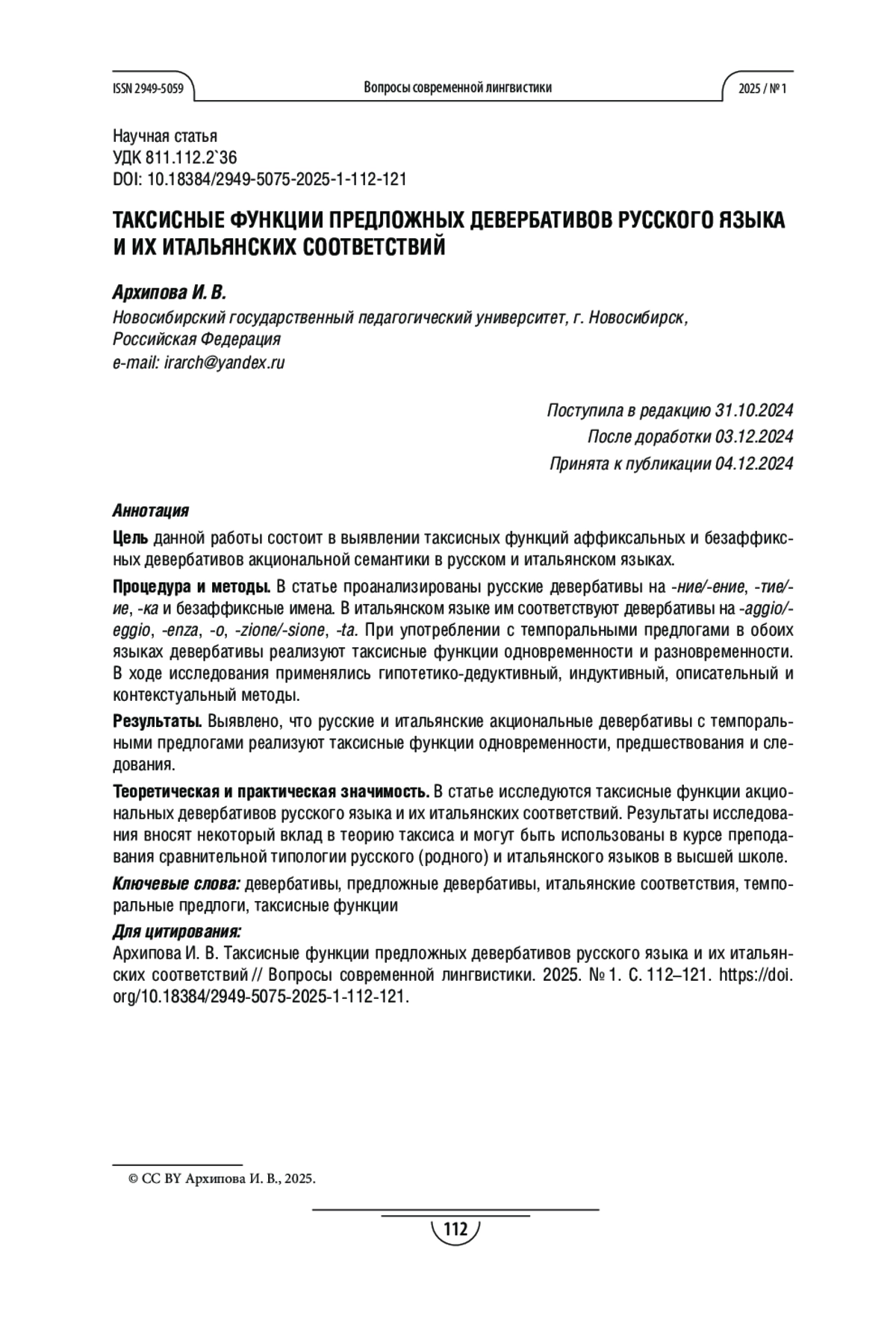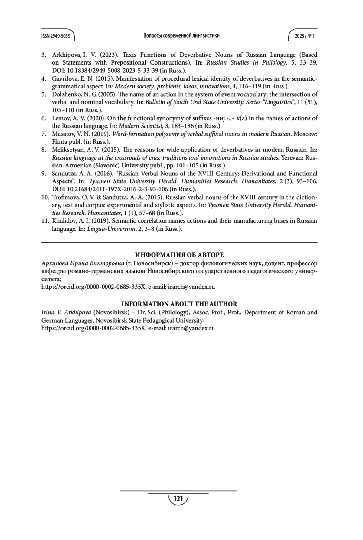 3. Архипова, И. В. Таксисные функции девербативных существительных русского языка (на материале высказываний с предложными конструкциями) / И. В. Архипова // Отечественная филология. - 2023. - № 5. - С. 33-39. DOI: 10.18384/2949-5008-2023-5-33-39 EDN: HEJYGV