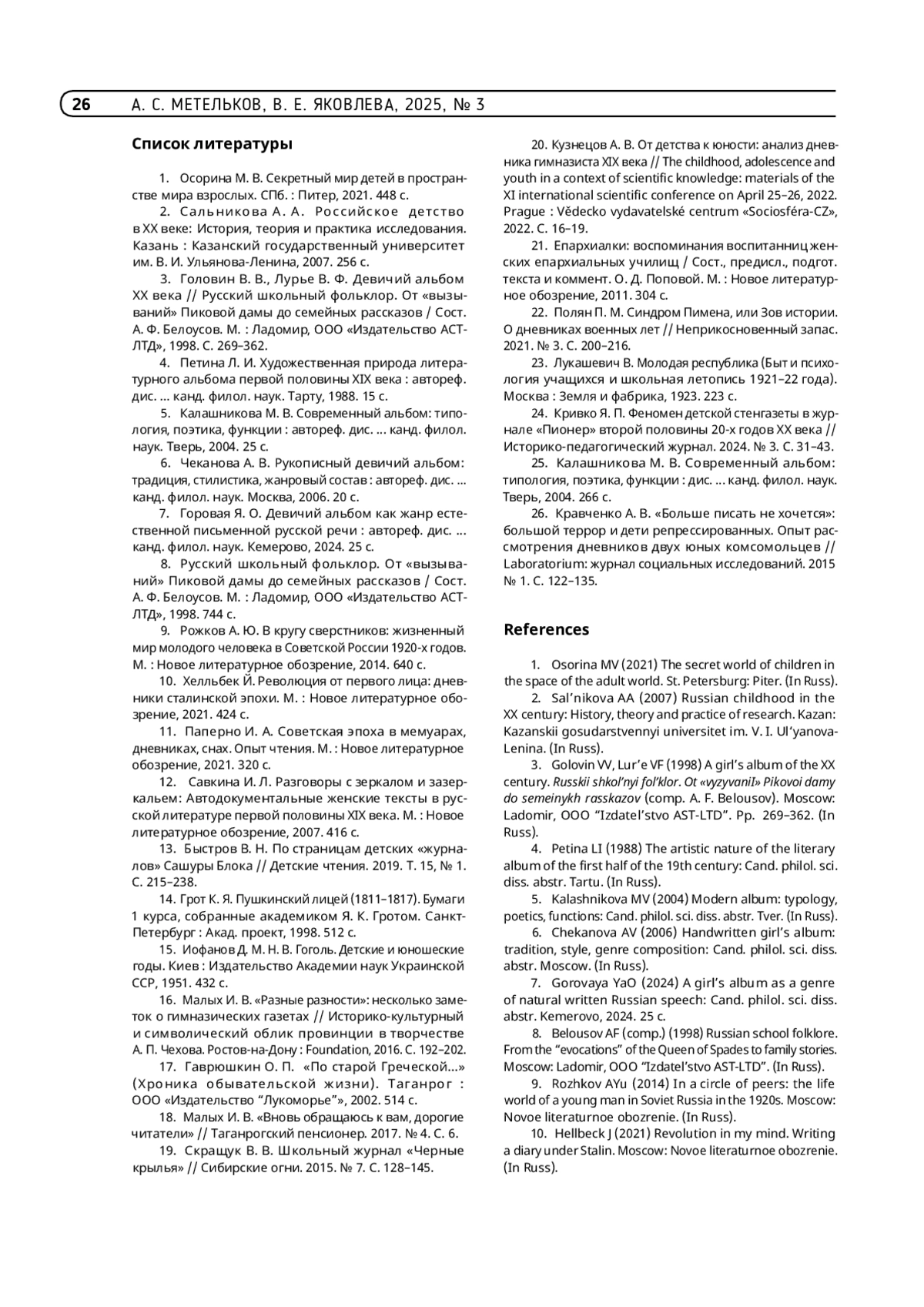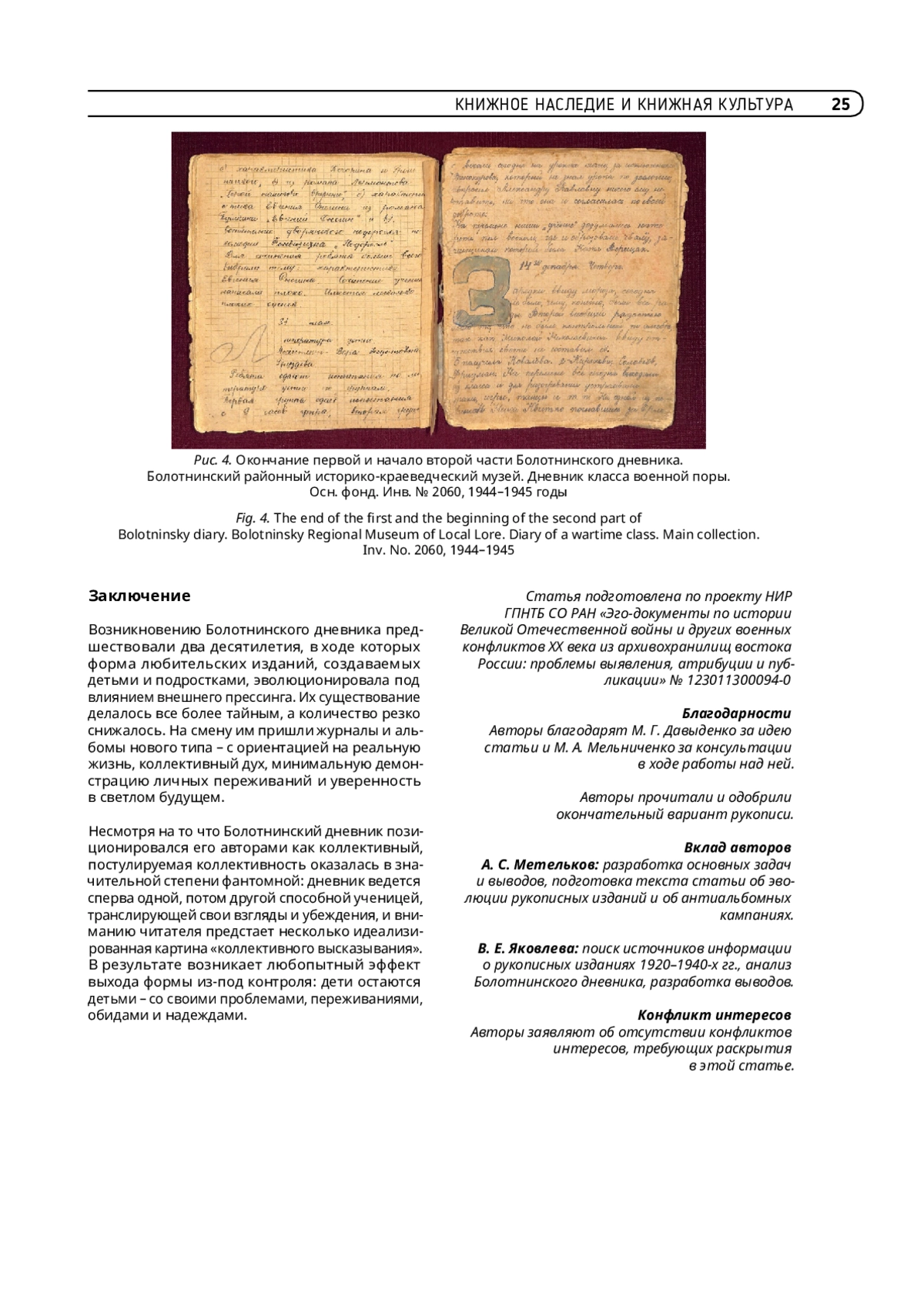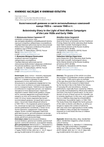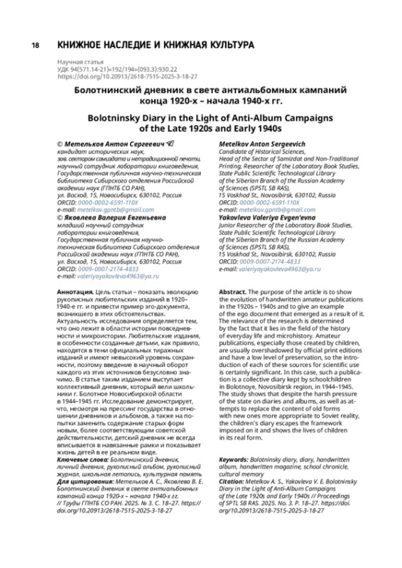 МЕТЕЛЬКОВ А. С., ЯКОВЛЕВА В. Е. БОЛОТНИНСКИЙ ДНЕВНИК В СВЕТЕ АНТИАЛЬБОМНЫХ КАМПАНИЙ КОНЦА 1920-Х – НАЧАЛА 1940-Х ГГ. // ТРУДЫ ГПНТБ СО РАН. 2025. № 3