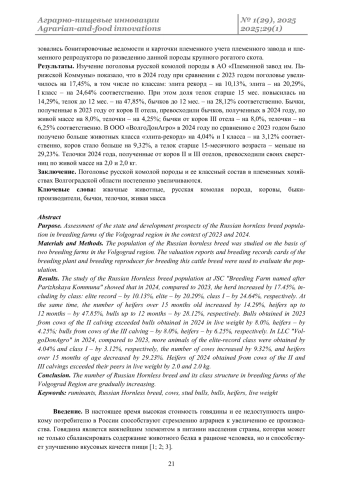 Результаты. Изучение поголовья русской комолой породы в АО «Племенной завод им. Парижской Коммуны» показало, что в 2024 году при сравнении с 2023 годом поголовье увеличилось на 17,45%, в том числе по классам: элита рекорд - на 10,13%, элита - на 20,29%, I класс - на 24,64% соответственно. При этом доля телок старше 15 мес. повысилась на 14,29%, телок до 12 мес. - на 47,85%, бычков до 12 мес. - на 28,12% соответственно. Бычки, полученные в 2023 году от коров II отела, превосходили бычков, полученных в 2024 году, по живой массе на 8,0%, телочки - на 4,25%; бычки от коров III отела - на 8,0%, телочки - на 6,25% соответственно. В ООО «ВолгоДонАгро» в 2024 году по сравнению с 2023 годом было получено больше животных класса «элита-рекорд» на 4,04% и I класса - на 3,12% соответственно, коров стало больше на 9,32%, а телок старше 15-месячного возраста - меньше на 29,23%. Телочки 2024 года, полученные от коров II и III отелов, превосходили своих сверстниц по живой массе на 2,0 и 2,0 кг.