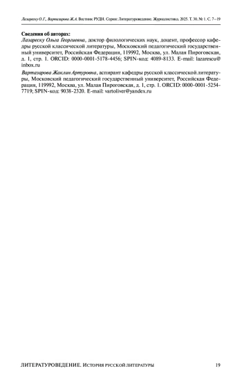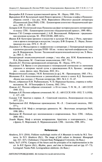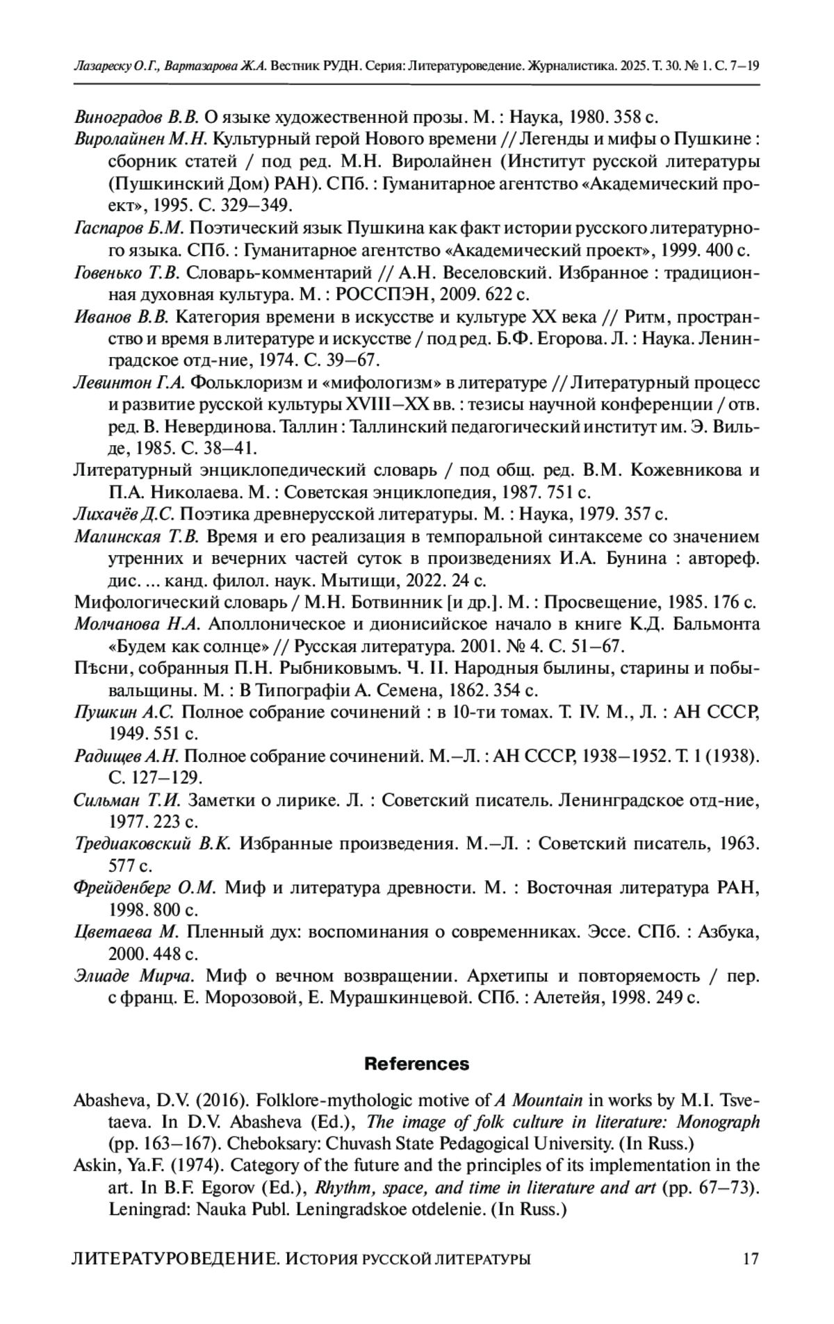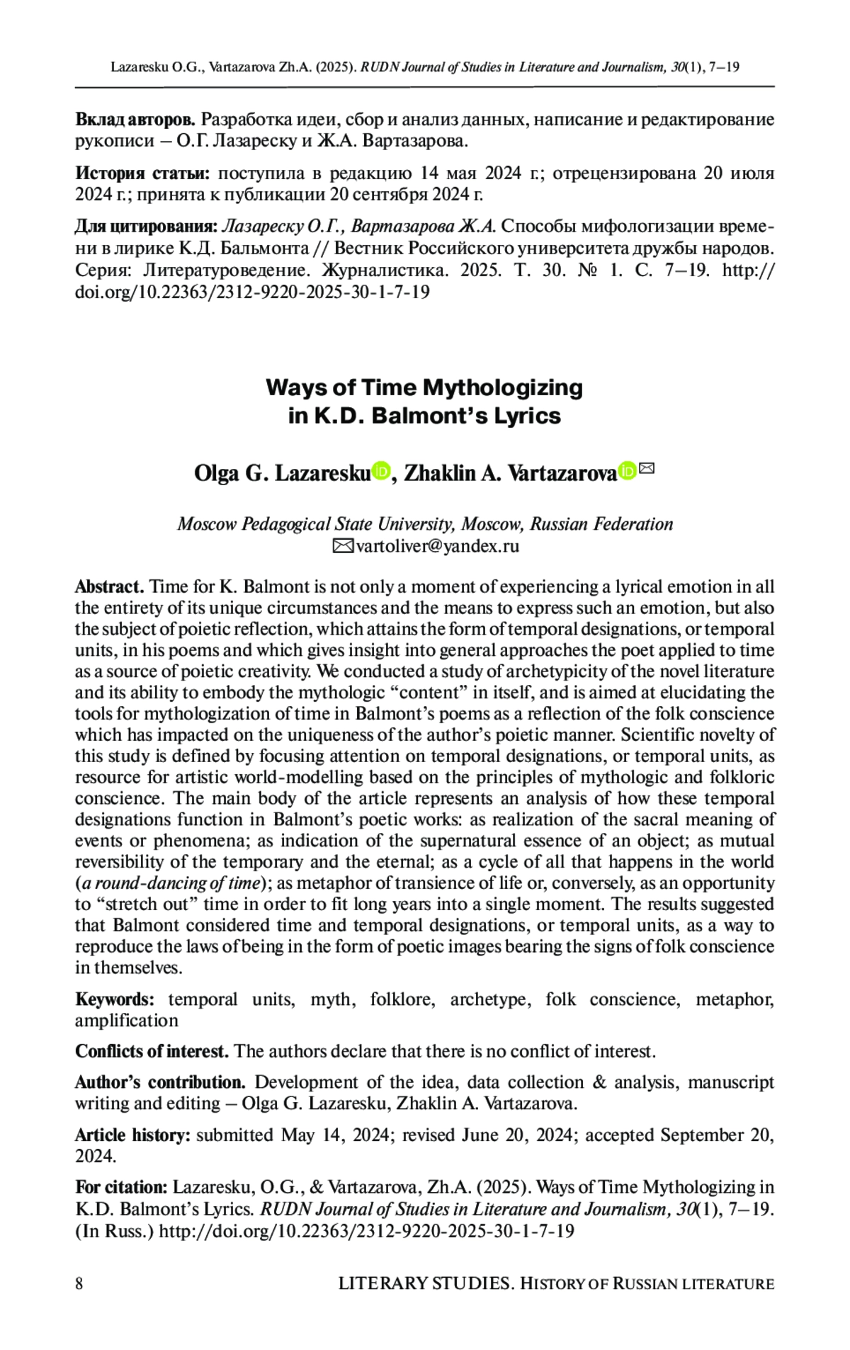 ЛАЗАРЕСКУ О. Г., ВАРТАЗАРОВА Ж. А. СПОСОБЫ МИФОЛОГИЗАЦИИ ВРЕМЕНИ В ЛИРИКЕ К. Д. БАЛЬМОНТА // ВЕСТНИК РОССИЙСКОГО УНИВЕРСИТЕТА ДРУЖБЫ НАРОДОВ. СЕРИЯ: ЛИТЕРАТУРОВЕДЕНИЕ. ЖУРНАЛИСТИКА. 2025. ТОМ 30 № 1