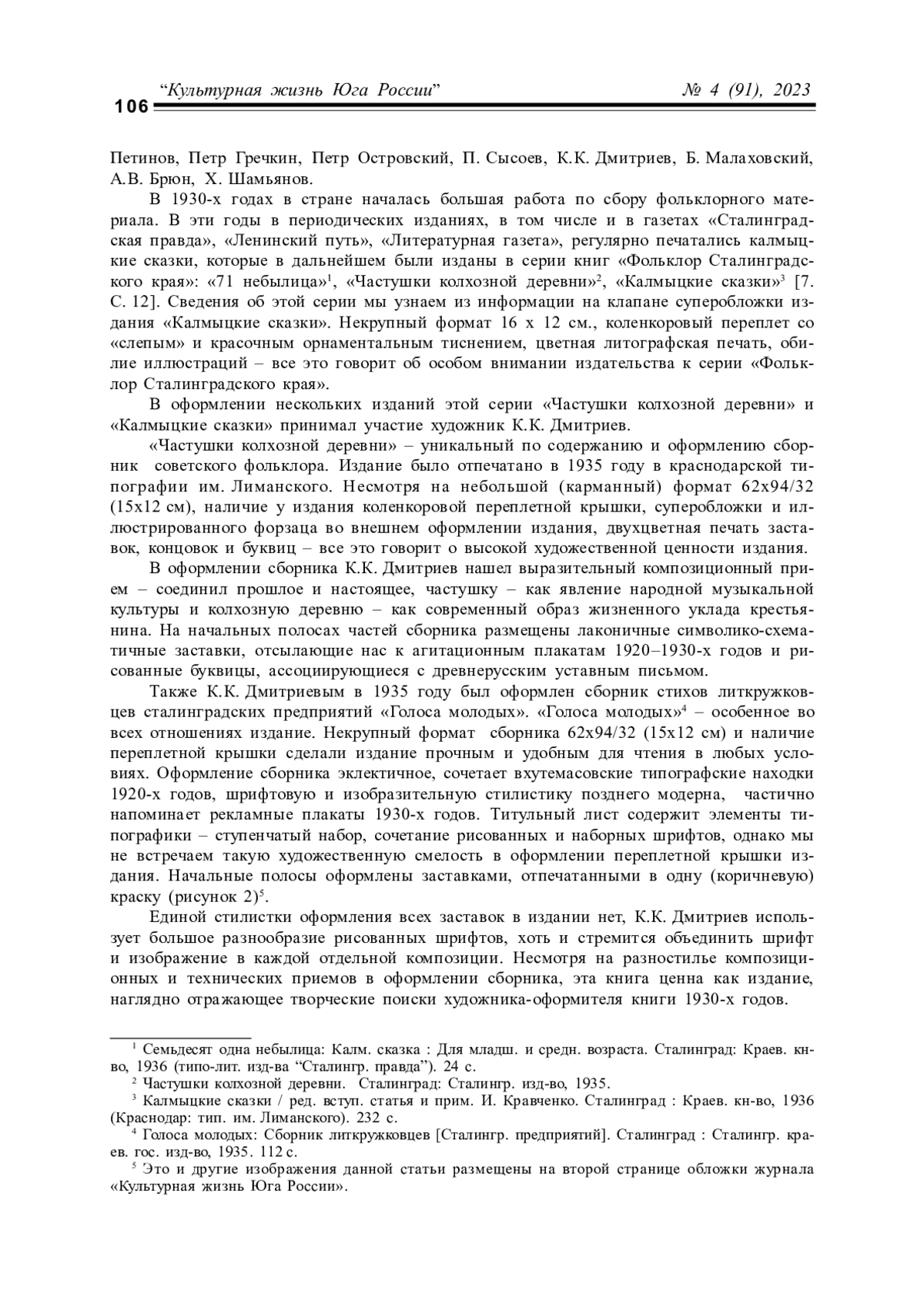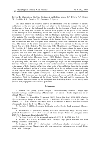 Предметом исследования стало состояние книжной графики в Сталинграде в довоенный период. В статье определен круг художников, сотрудничавших в 1935–1941 годах со Сталинградским книжным издательством. Рассмотрены издания, оформленные художниками П. Ф. Гречкиным, П. П. Быковым, А. П. Быковым, К. К. Дмитриевым, П. П. Островским, П. Сысоевым.