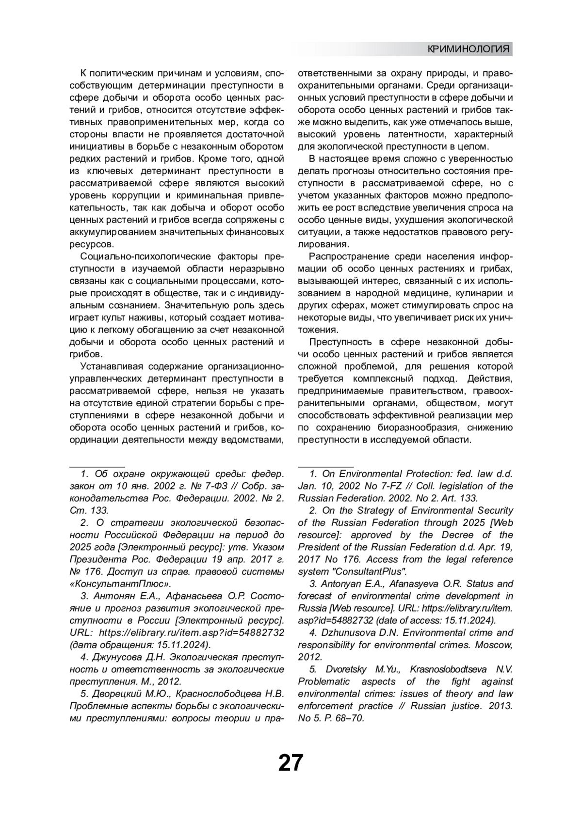 3. Антонян Е.А., Афанасьева О.Р. Состояние и прогноз развития экологической преступности в России [Электронный ресурс]. URL: https://elibrary.ru/item.asp?id=54882732 (дата обращения: 15.11.2024).