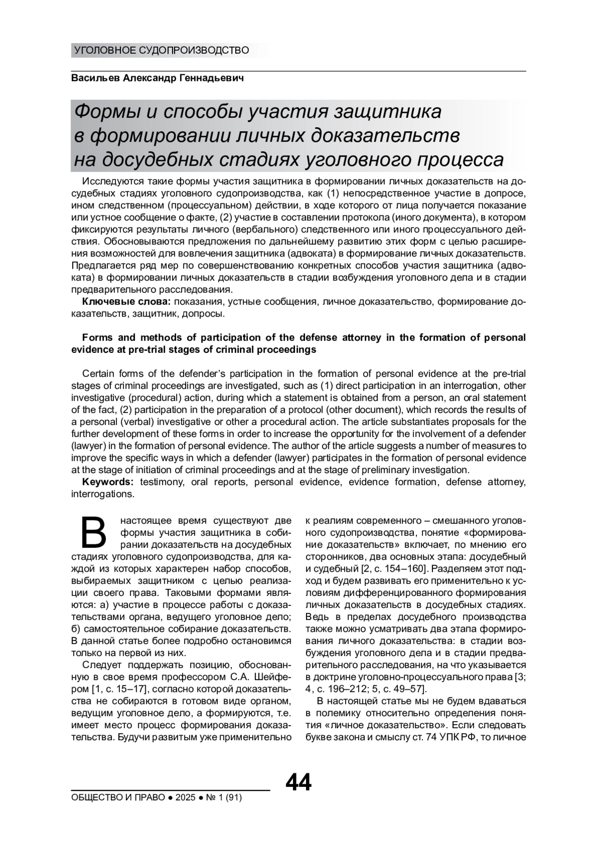 Исследуются такие формы участия защитника в формировании личных доказательств на досудебных стадиях уголовного судопроизводства, как (1) непосредственное участие в допросе, ином следственном (процессуальном) действии, в ходе которого от лица получается показание или устное сообщение о факте, (2) участие в составлении протокола (иного документа), в котором фиксируются результаты личного (вербального) следственного или иного процессуального действия. Обосновываются предложения по дальнейшему развитию этих форм с целью расширения возможностей для вовлечения защитника (адвоката) в формирование личных доказательств. Предлагается ряд мер по совершенствованию конкретных способов участия защитника (адвоката) в формировании личных доказательств в стадии возбуждения уголовного дела и в стадии предварительного расследования