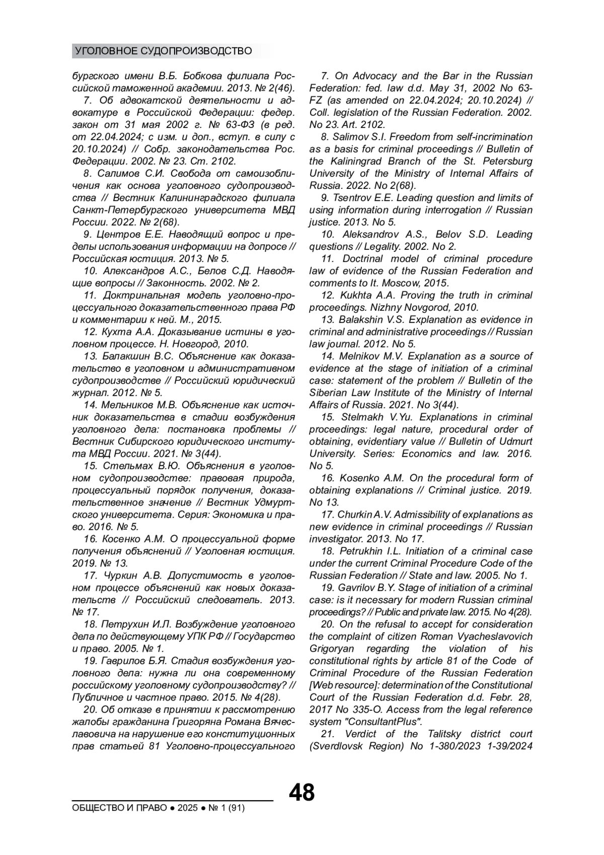 8. Салимов С.И. Свобода от самоизобличения как основа уголовного судопроизводства // Вестник Калининградского филиала Санкт-Петербургского университета МВД России. 2022. № 2(68).
