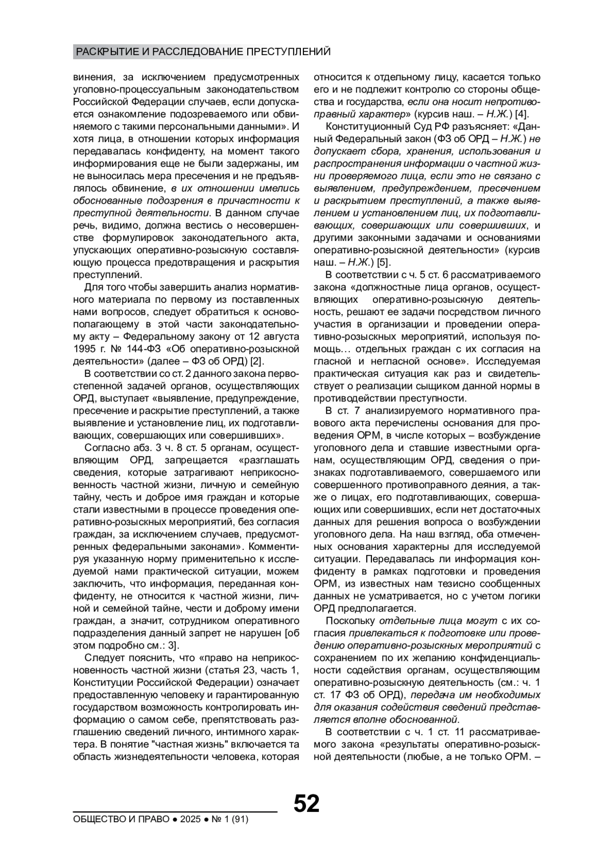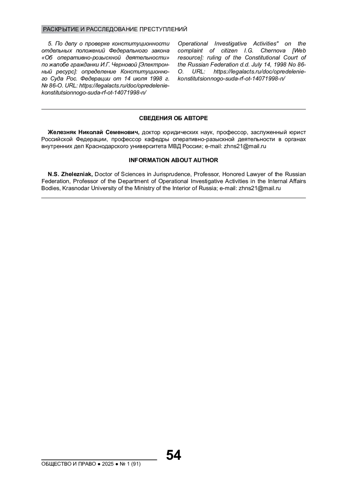 ЖЕЛЕЗНЯК Н. С. ПЕРСОНАЛЬНЫЕ ДАННЫЕ ГРАЖДАН КАК ОБЪЕКТ ПРАВОВОЙ КОЛЛИЗИИ В ОБЛАСТИ ОПЕРАТИВНО-РОЗЫСКНОЙ ДЕЯТЕЛЬНОСТИ // ОБЩЕСТВО И ПРАВО. 2025. № 1 (91)