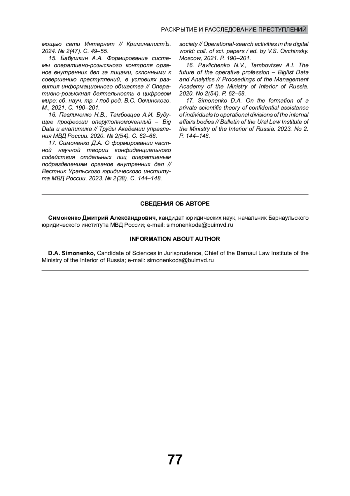 17. Симоненко Д.А. О формировании частной научной теории конфиденциального содействия отдельных лиц оперативным подразделениям органов внутренних дел // Вестник Уральского юридического института МВД России. 2023. № 2(38). С. 144-148. EDN: DPVACI