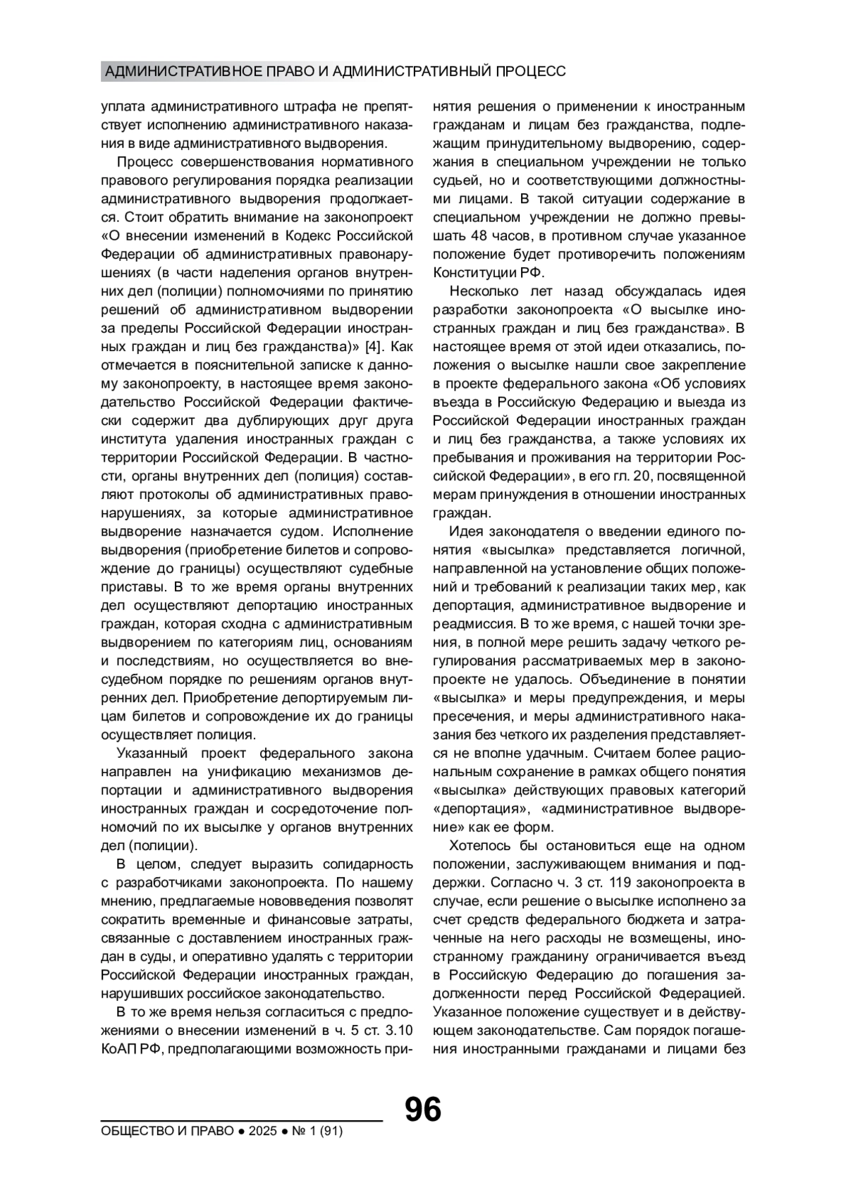 Охарактеризовано современное состояние правового регулирования административного выдворения иностранных граждан и лиц без гражданства, определено соотношение таких понятий, как высылка и административное выдворение. Проведен анализ существующих законодательных инициатив по рассматриваемому вопросу. Автором высказаны предложения по дальнейшему совершенствованию нормативного правового регулирования административного выдворения и высылки