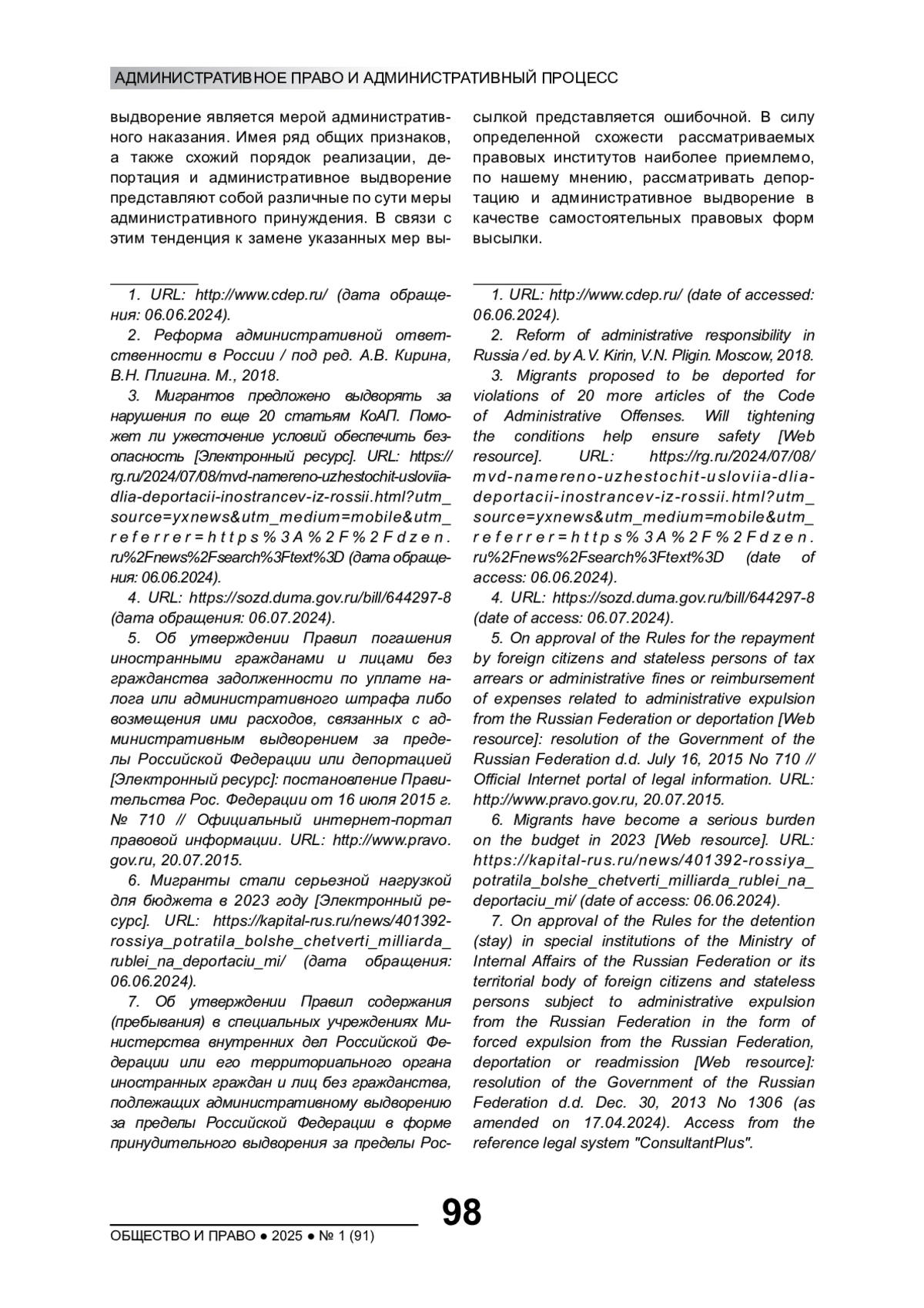7. Об утверждении Правил содержания (пребывания) в специальных учреждениях Министерства внутренних дел Российской Федерации или его территориального органа иностранных граждан и лиц без гражданства, подлежащих административному выдворению за пределы Российской Федерации в форме принудительного выдворения за пределы Российской Федерации, депортации или реадмиссии [Электронный ресурс]: постановление Правительства Рос. Федерации от 30 дек. 2013 г. № 1306 (в ред. от 17.04.2024). Доступ из справ. правовой системы “КонсультантПлюс”.