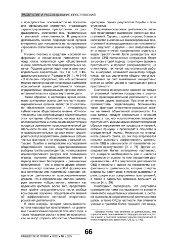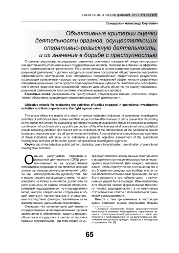 Отражены результаты исследования различных оценочных показателей оперативно-розыскной деятельности уполномоченных государственных органов, показано их влияние на эффективность противодействия преступности. По мнению автора, в основе критериев оценки оперативнорозыскной деятельности должно находиться сочетание показателей общественного восприятия эффективности деятельности всех оперативных подразделений; статистических результатов, отражающих выявленные и раскрытые преступления; показателей эффективности затраченных оперативно-розыскных сил и средств правоохранительных субъектов. Комплексное сопоставление и синтез предложенных показателей позволит дать общую объективную оценку оперативнорозыскной деятельности всей системы оперативно-розыскных органов