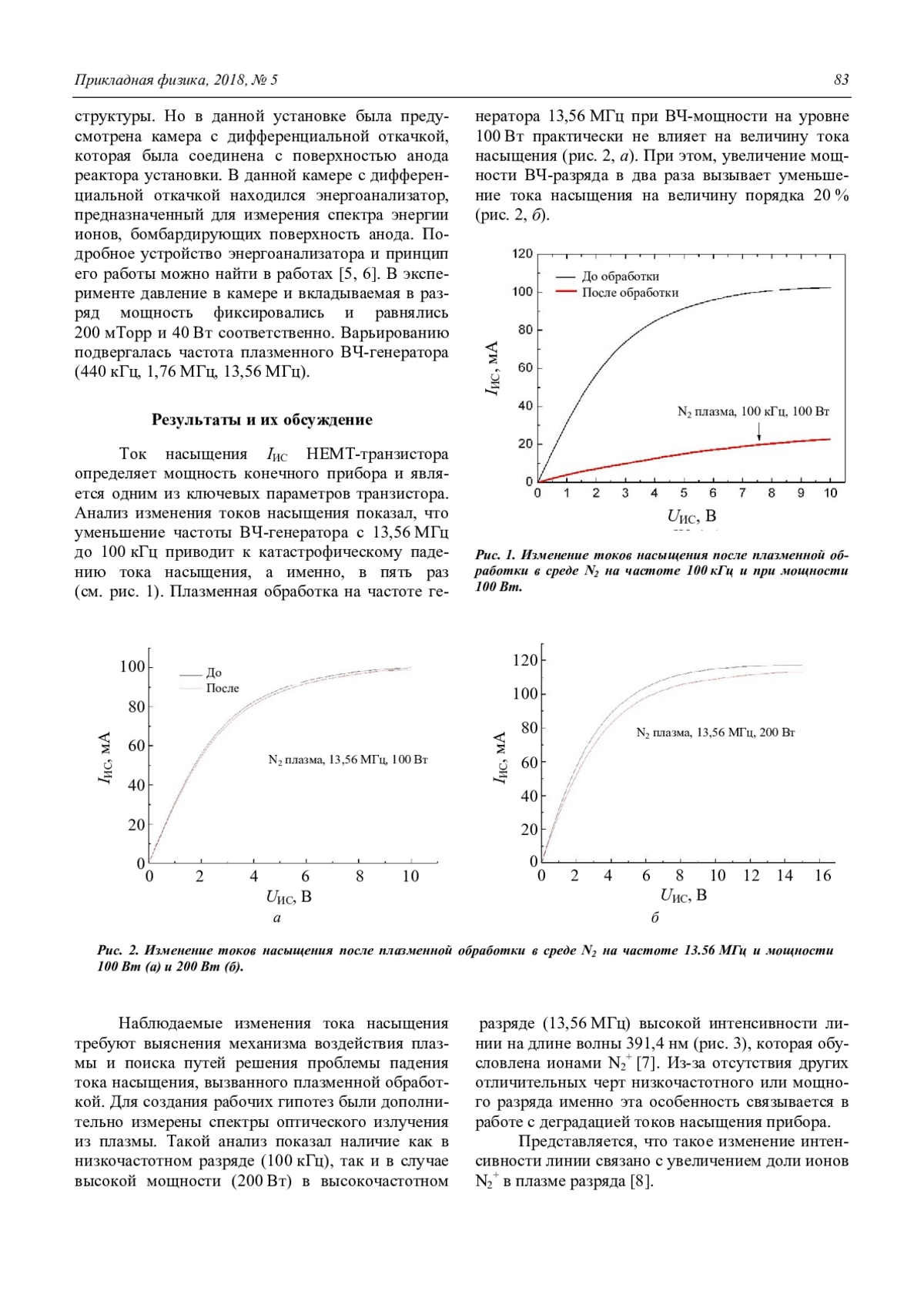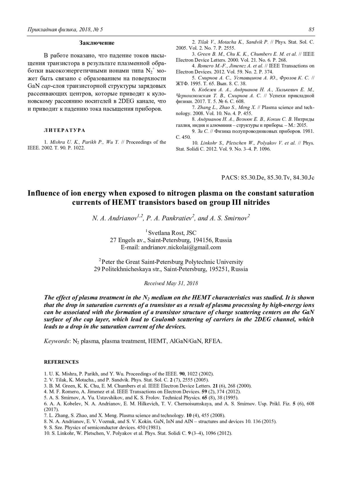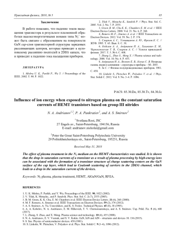 Статья: Влияние энергии ионов при воздействии азотной плазмы на постоянные токи насыщения HEMT-транзисторов на основе нитридов III группы (2018)