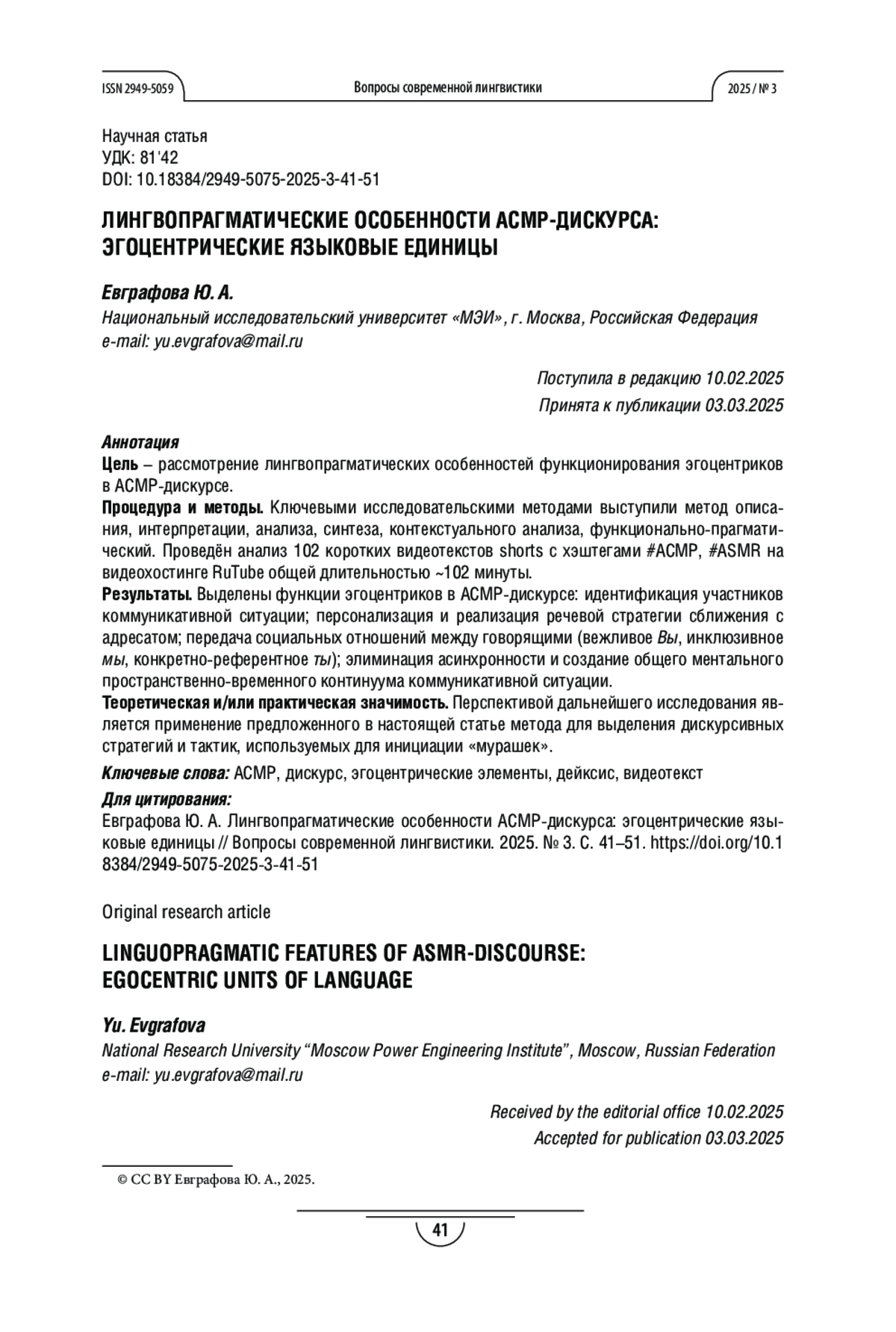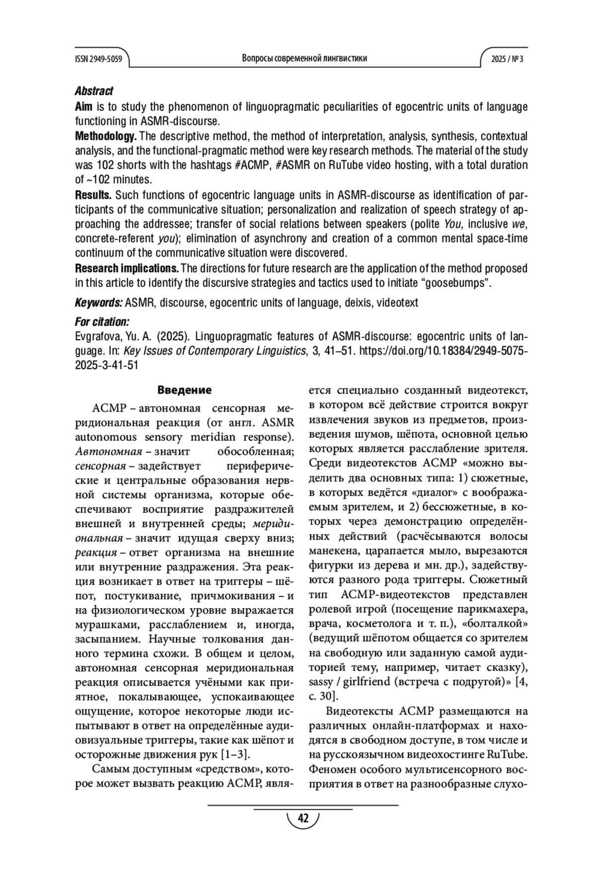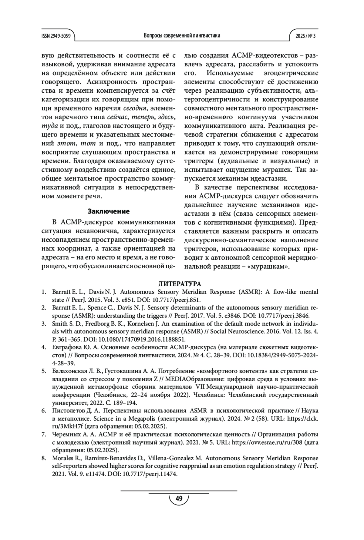 4. Евграфова Ю.А. Основные особенности АСМР-дискурса (на материале сюжетных видеотекстов) // Вопросы современной лингвистики. 2024. № 4. С.28-39. DOI: 10.18384/2949-5075-2024-4-28-39