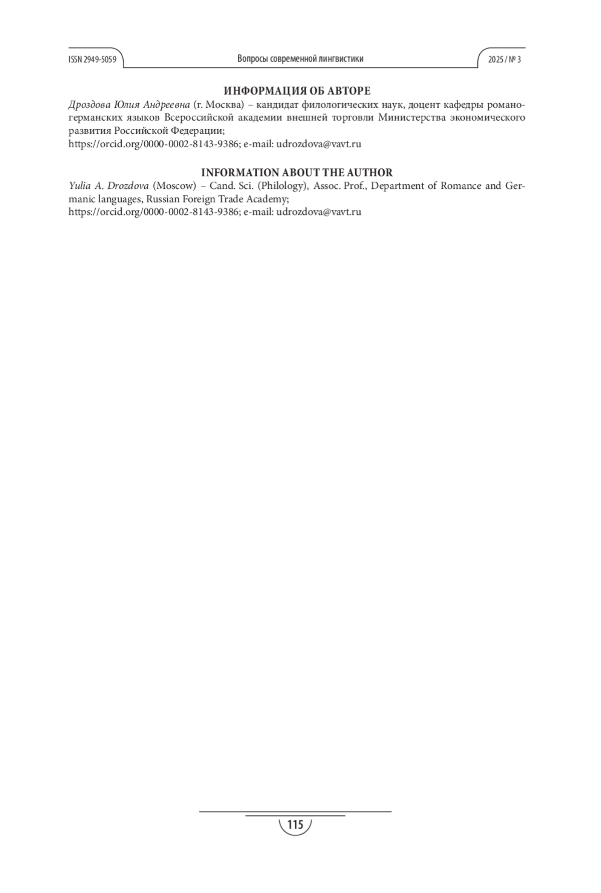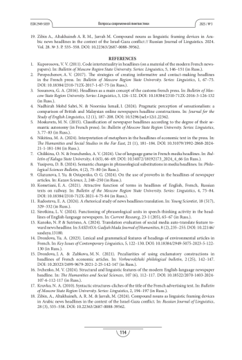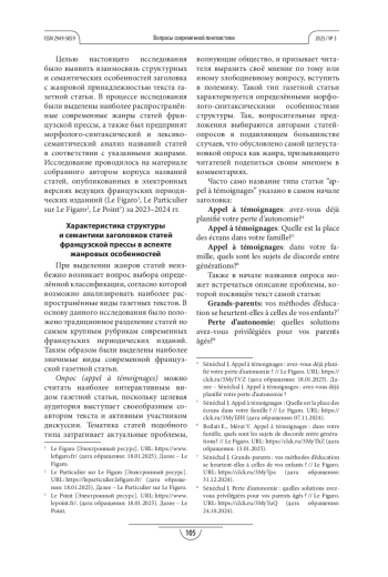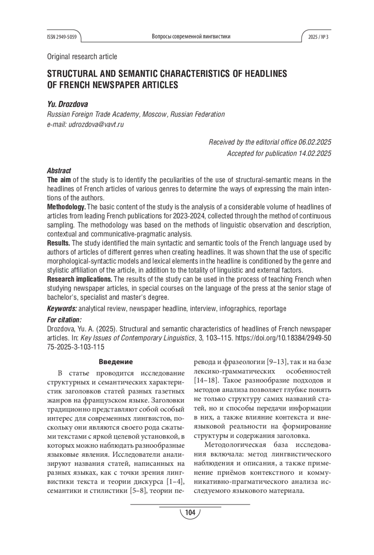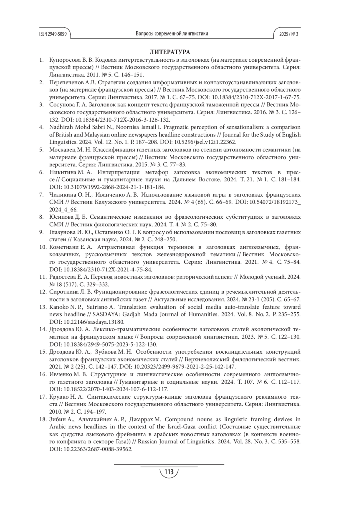 ДРОЗДОВА Ю. А. СТРУКТУРНО-СЕМАНТИЧЕСКАЯ ХАРАКТЕРИСТИКА ЗАГОЛОВКОВ ФРАНЦУЗСКИХ ГАЗЕТНЫХ СТАТЕЙ // ВОПРОСЫ СОВРЕМЕННОЙ ЛИНГВИСТИКИ. 2025. № 3