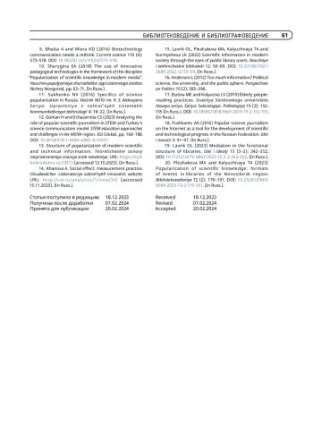 15. Лаврик О. Л., Плешакова М. А., Калюжная Т. А., Курмышева Л. К. Научная информация в современном обществе в оценке читателей публичных библиотек // Научные и технические библиотеки. 2022. № 12. С. 50-69. https://doi.org/10.33186/1027-3689-2022-12-50-69.