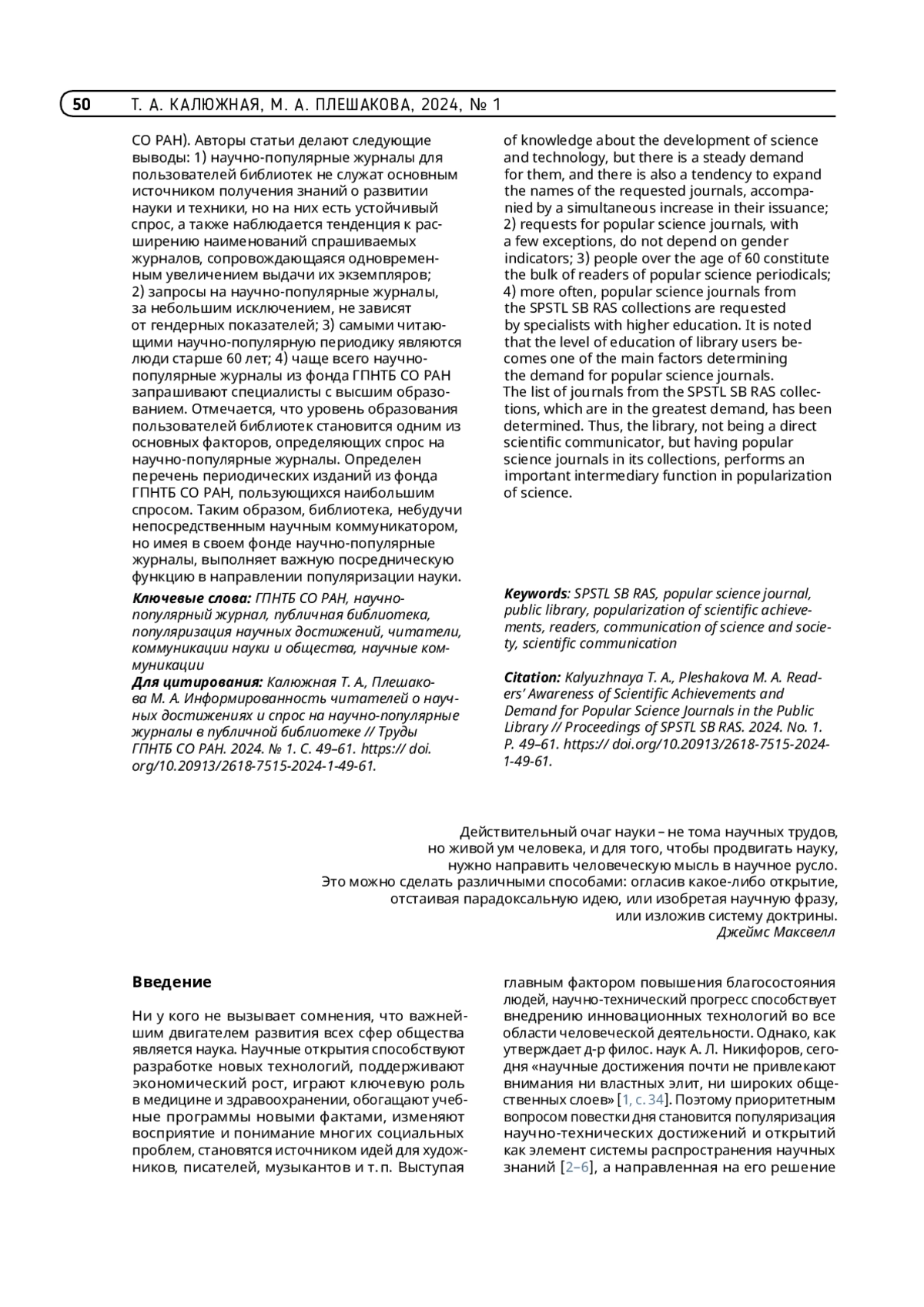 Значимая роль науки в развитии всех сфер общества неоспорима, она обеспечивает прогресс и улучшение качества жизни, способствует внедрению инновационных технологий во все области человеческой деятельности. Сегодня на повестке дня стоит вопрос популяризации научных достижений, а также развития информационных каналов, которые позволят обществу лучше понимать значимость научных открытий и их влияние на культуру, идентичность, ценности и поведение человека. Цель статьи – оценить, насколько читатели библиотеки информированы о последних научных достижениях и какова в этом роль библиотеки. В работе рассматривается место библиотеки в системе взаимоотношений между учеными и широкой общественностью. Фиксируется, что эффективным средством популяризации науки являются журналы, регулярно публикующие свежие актуальные материалы. Анализируется информированность читателей публичных библиотек о научных достижениях и изучается спрос на научно-популярные журналы, имеющиеся в фонде Государственной публичной научно-технической библиотеки Сибирского отделения Российской академии наук (ГПНТБ СО РАН). Авторы статьи делают следующие выводы: 1) научно-популярные журналы для пользователей библиотек не служат основным источником получения знаний о развитии науки и техники, но на них есть устойчивый спрос, а также наблюдается тенденция к расширению наименований спрашиваемых журналов, сопровождающаяся одновременным увеличением выдачи их экземпляров; 2) запросы на научно-популярные журналы, за небольшим исключением, не зависят от гендерных показателей; 3) самыми читающими научно-популярную периодику являются люди старше 60 лет; 4) чаще всего научно-популярные журналы из фонда ГПНТБ СО РАН запрашивают специалисты с высшим образованием. Отмечается, что уровень образования пользователей библиотек становится одним из основных факторов, определяющих спрос на научно-популярные журналы. Определен перечень периодических изданий из фонда ГПНТБ СО РАН, пользующихся наибольшим спросом. Таким образом, библиотека, не будучи непосредственным научным коммуникатором, но имея в своем фонде научно-популярные журналы, выполняет важную посредническую функцию в направлении популяризации науки.