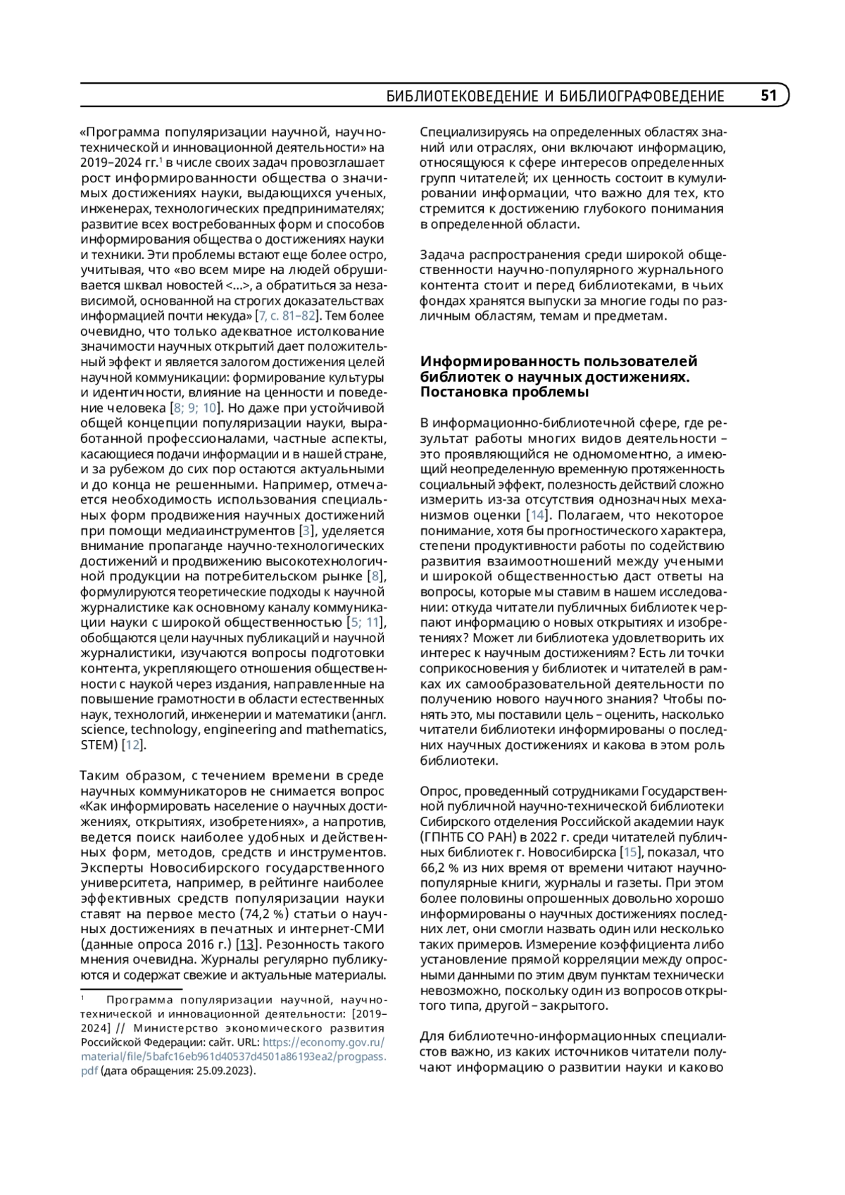 Опрос, проведенный сотрудниками Государственной публичной научно-технической библиотеки Сибирского отделения Российской академии наук (ГПНТБ СО РАН) в 2022 г. среди читателей публичных библиотек г. Новосибирска [15], показал, что 66,2 % из них время от времени читают научнопопулярные книги, журналы и газеты.