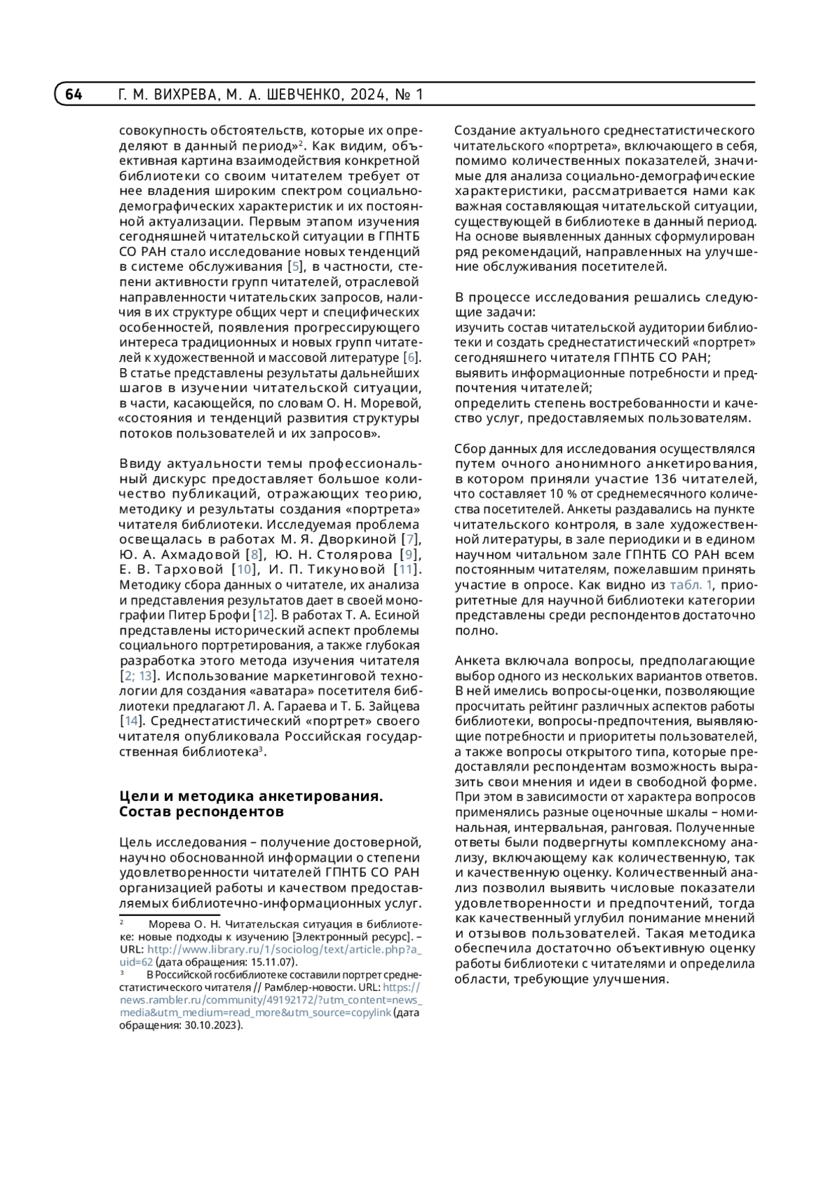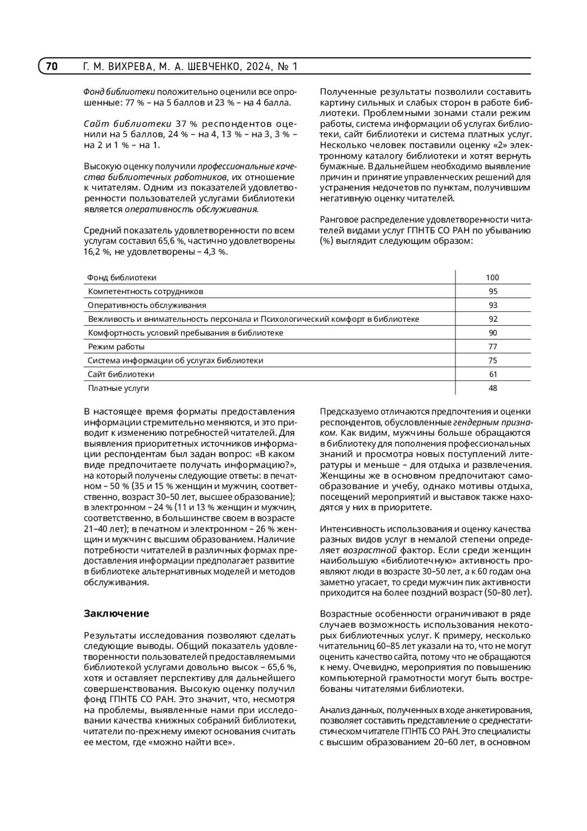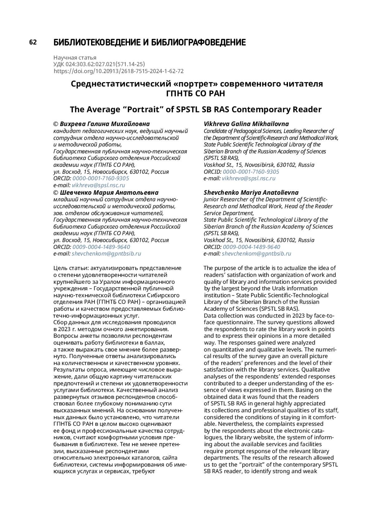 Сбор данных для исследования проводился в 2023 г. методом очного анкетирования. Вопросы анкеты позволяли респондентам оценивать работу библиотеки в баллах, а также выражать свое мнение более развернуто. Полученные ответы анализировались на количественном и качественном уровнях. Результаты опроса, имеющие числовое выражение, дали общую картину читательских предпочтений и степени их удовлетворенности услугами библиотеки. Качественный анализ развернутых отзывов респондентов способствовал более глубокому пониманию сути высказанных мнений. На основании полученных данных было установлено, что читатели ГПНТБ СО РАН в целом высоко оценивают ее фонд и профессиональные качества сотрудников, считают комфортными условия пребывания в библиотеке. Тем не менее претензии, высказанные респондентами относительно электронных каталогов, сайта библиотеки, системы информирования об имеющихся услугах и сервисах, требуют оперативной реакции соответствующих библиотечных подразделений. Итоги исследования позволили получить «портрет» современного читателя ГПНТБ СО РАН, обозначить сильные и слабые стороны в работе с ним и сформулировать предложения для решения ряда выявленных проблем и определить шаги по совершенствованию системы обслуживания в библиотеке.