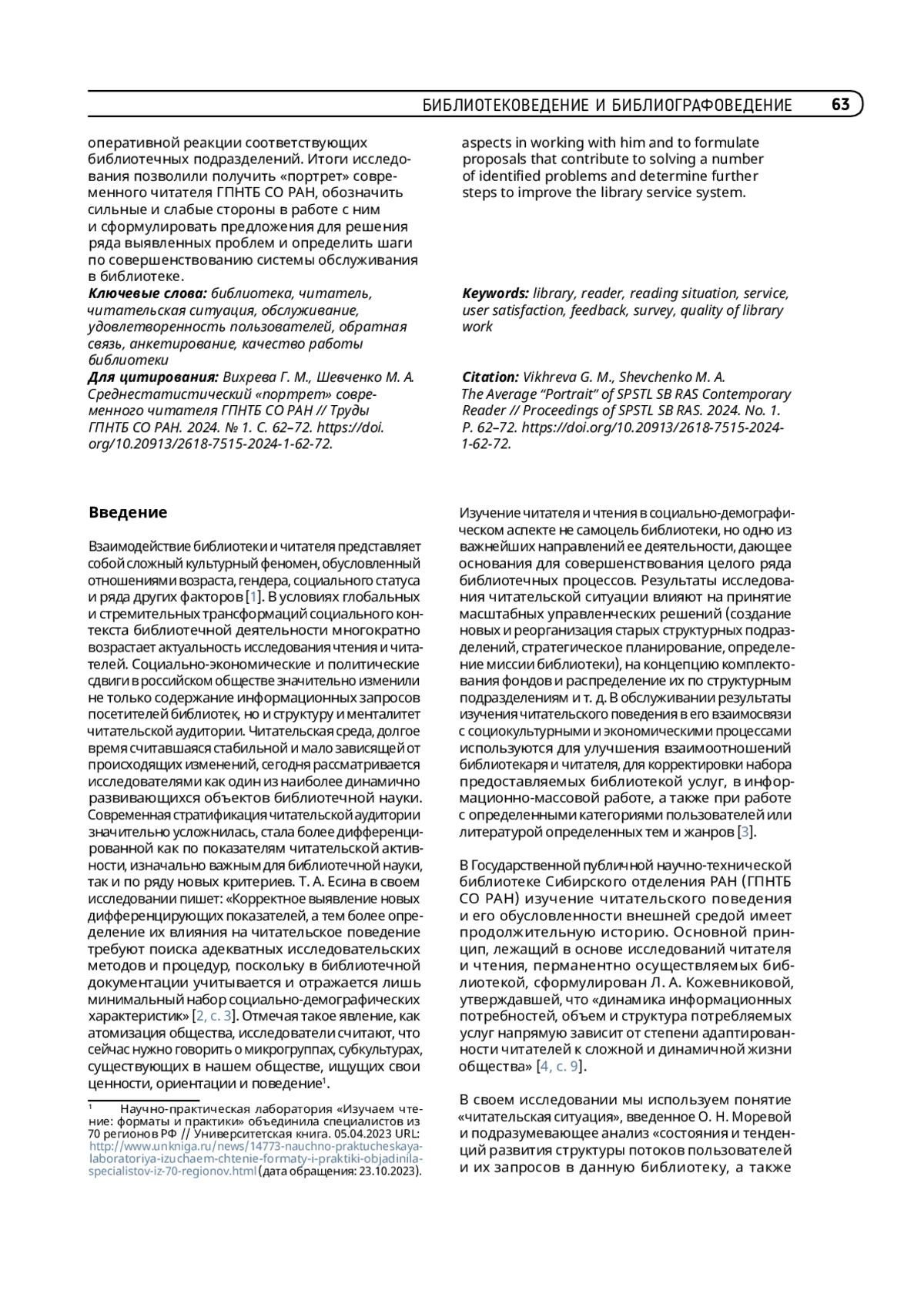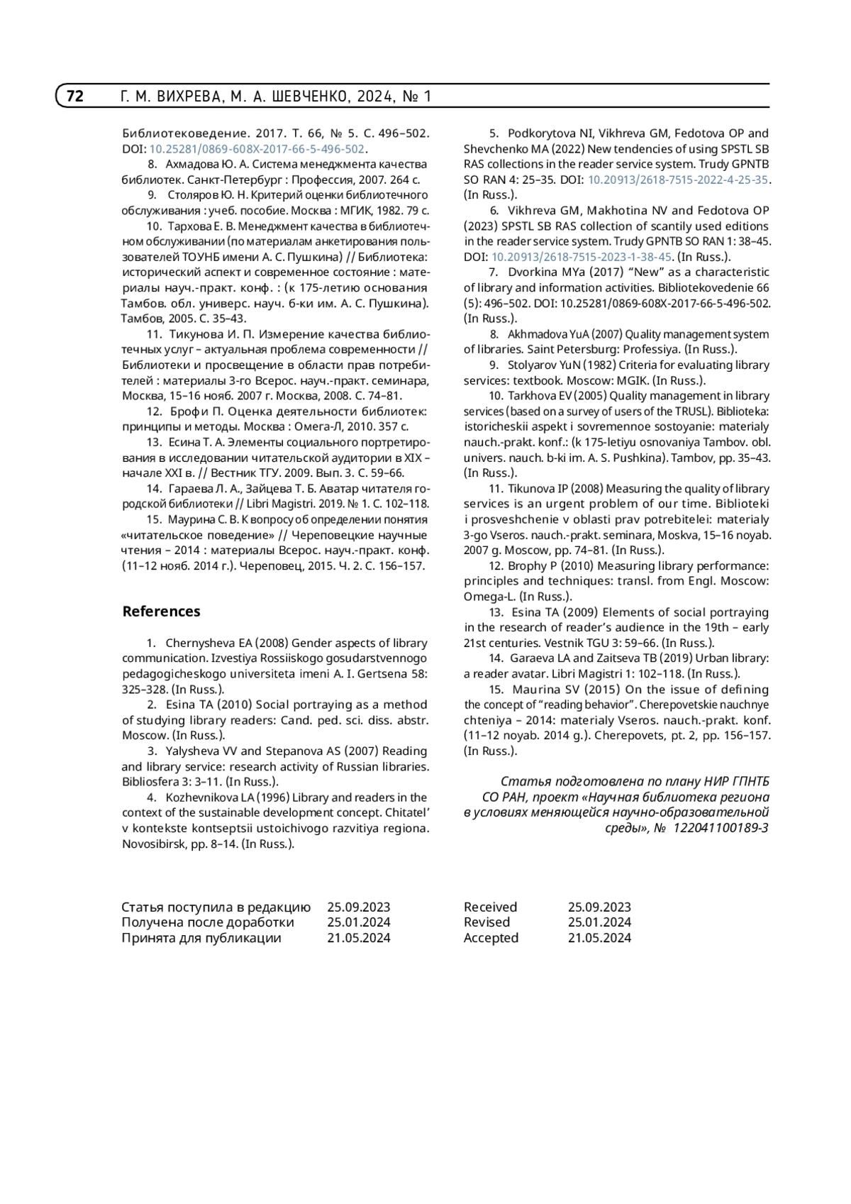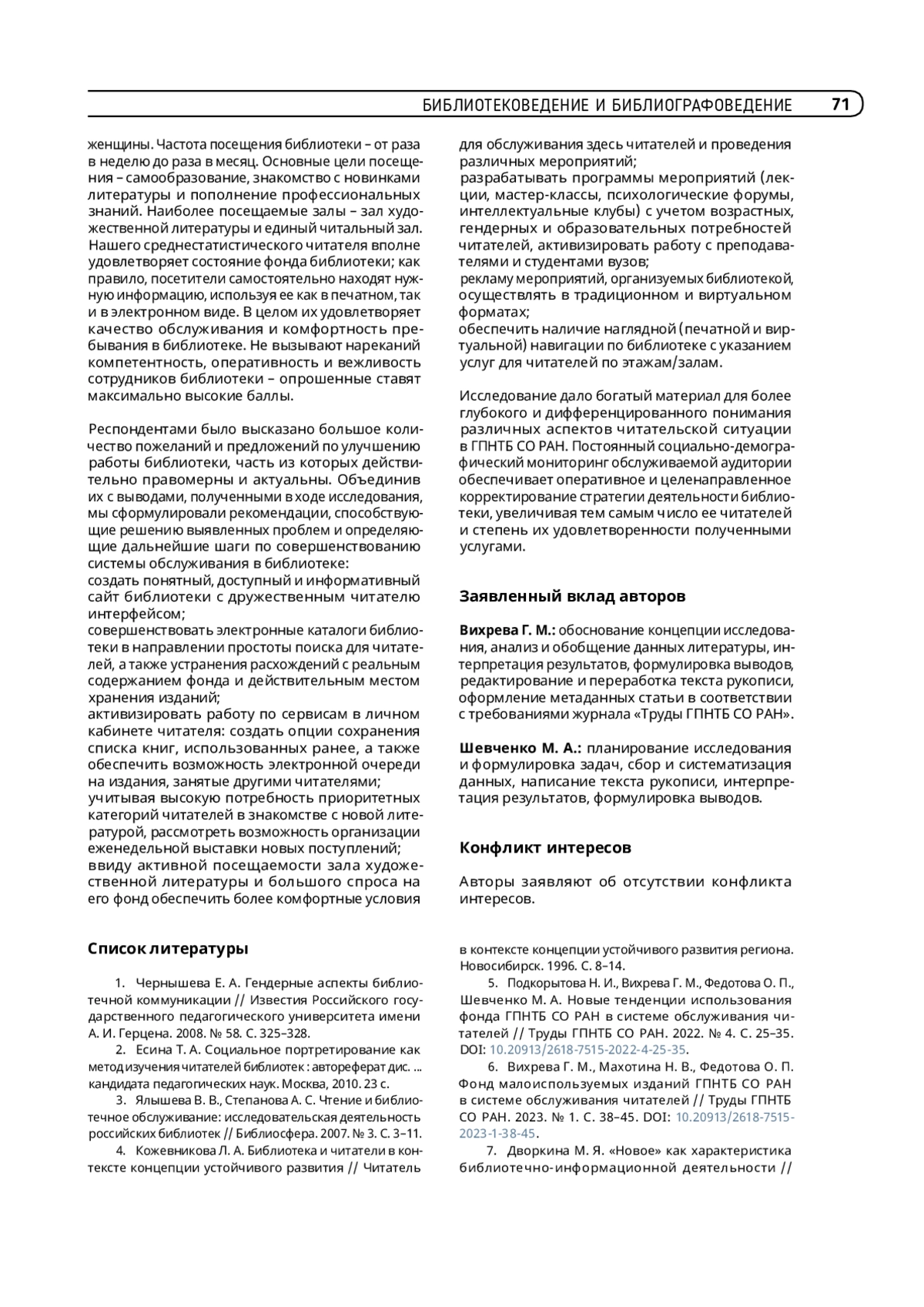 5. Подкорытова Н. И., Вихрева Г. М., Федотова О. П., Шевченко М. А. Новые тенденции использования фонда ГПНТБ СО РАН в системе обслуживания читателей // Труды ГПНТБ СО РАН. 2022. № 4. С. 25-35. https://doi.org/10.20913/2618-7515-2022-4-25-35.