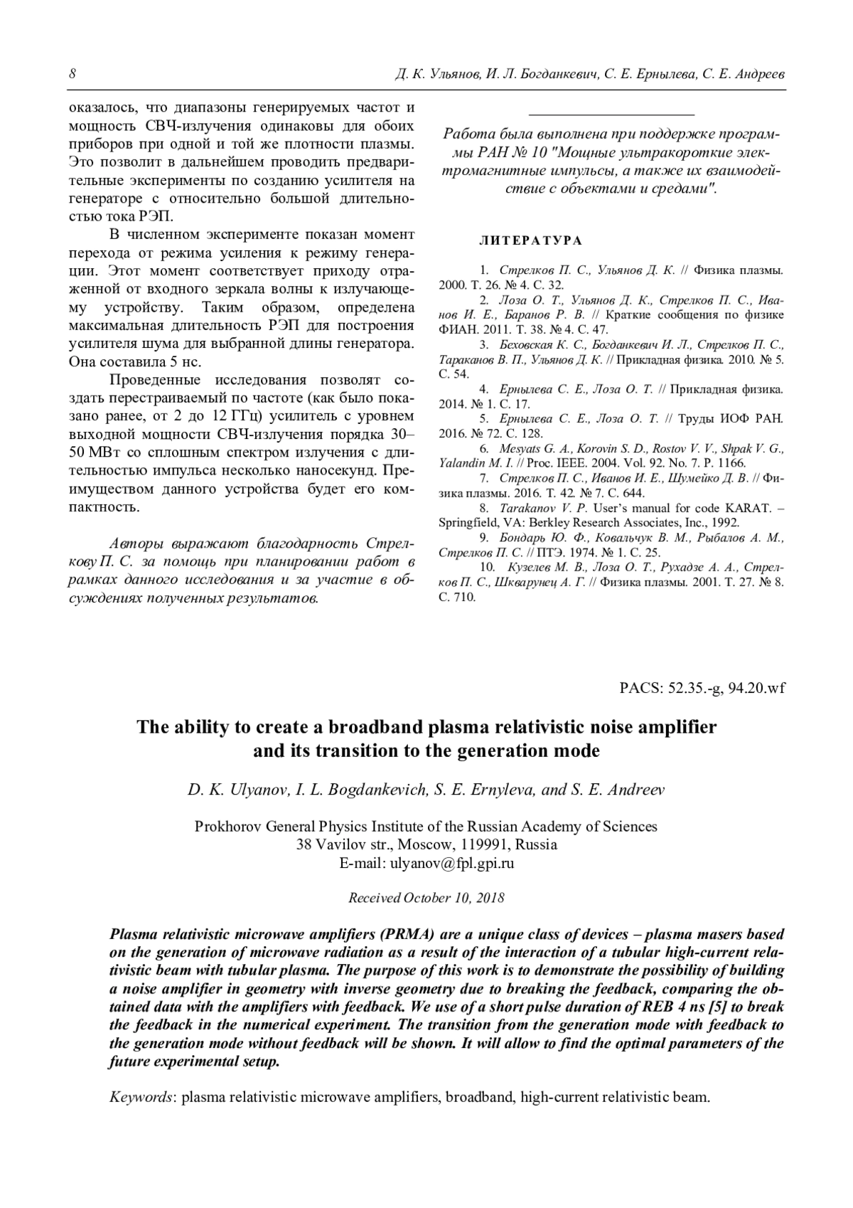 2. Лоза О. Т., Ульянов Д. К., Стрелков П. С., Иванов И. Е., Баранов Р. В. // Краткие сообщения по физике ФИАН. 2011. Т. 38. № 4. С. 47.