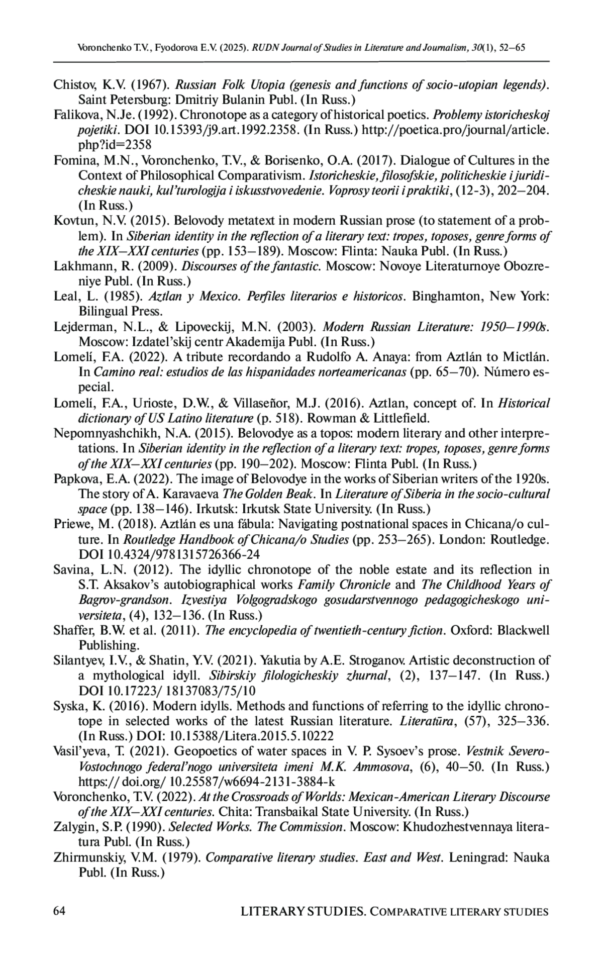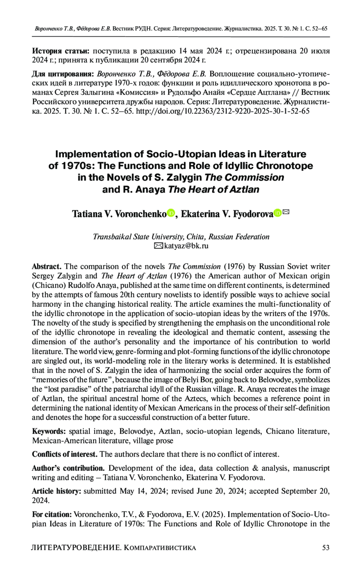 Сопоставление романов русского советского писателя Сергея Залыгина «Комиссия» (1976) и американского автора мексиканского происхождения (чикано) Рудольфо Анайя «Сердце Ацтлана» (1976), опубликованных в одно время на разных континентах, обусловлено стремлением известных прозаиков XX века определить возможные пути достижения общественной гармонии в меняющейся исторической реальности. В статье рассматривается полифункциональность идиллического хронотопа при использовании писателями 70-х годов XX века социально-утопических идей. Новизна исследования определена усилением акцента на безусловной роли идиллического хронотопа в раскрытии идейно-тематического содержания, оценке масштаба личности автора и важности его вклада в мировую литературу. Выделены мировоззренческая, жанро- и сюжетообразующая функции идиллического хронотопа, определена его миромоделирующая роль в художественных произведениях. Установлено, что в романе С. Залыгина идея о гармонизации общественного порядка приобретает форму «воспоминаний о будущем», поскольку образ Белого Бора, восходящий к Беловодью, символизирует «потерянный рай» патриархальной идиллии русской деревни. Р. Анайя воссоздает образ духовной прародины ацтеков - Ацтлана, который становится ориентиром в определении национальной идентичности американцев мексиканского происхождения в процессе их самоутверждения и возлагает надежду на благополучное построение светлого будущего.