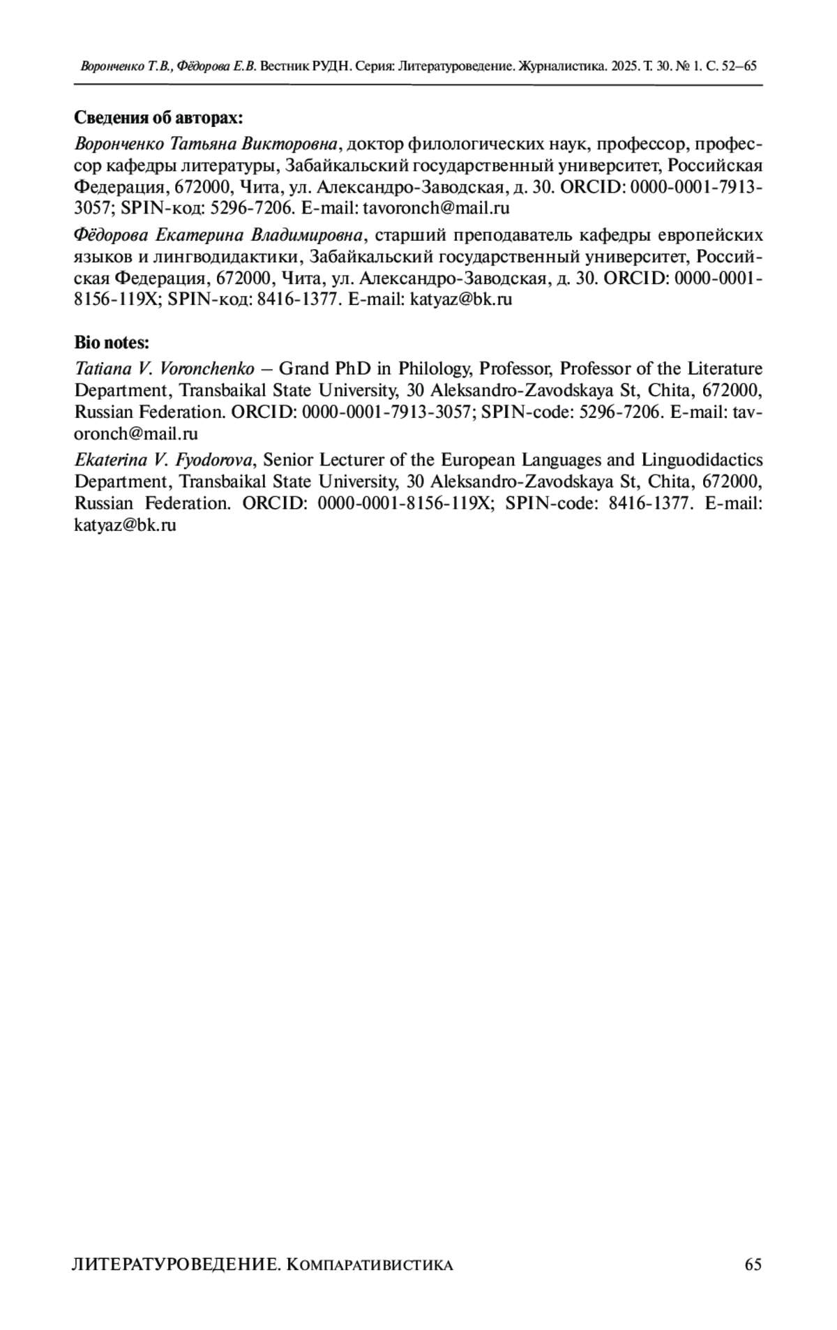 Цель исследования – анализ проблемы взросления в произведениях автора. Доминанта внутреннего становления влияет на центральные мотивы, тип героя (ребенок или подросток), повествовательную технику (от перво го или от третьего лица с психологическими и философскими отступлениями), что в конечном итоге дает читателю возможность увидеть внутренний мир центральных персонажей. Подчеркивается связь прозы Д. Тартт с жанром литературы для моло дого читателя, выявляются коннотации и символика, с помощью которых создают ся косвенные характеристики действующих лиц. Контекстуальный анализ трех ро манов позволяет выявить специфику внутреннего мира героев и особенности их мировоззрения. Прозаические образы Д. Тартт вписаны в мир литературы и искус ства, поэтому особенностью нарратива является интертекстуальность. Настоящая статья вносит вклад в развитие теории литературы и поэтики. Практическая значи мость результатов исследования определяется возможностью их использования в преподавании современной американской литературы и стилистики.