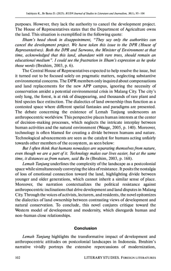 Цель – раскрыть влияние антропоцентризма на постколониальную Индонезию на материале романа Ратны Индрасвари Ибрахим «Лема Танджун». В повествовании ярко изображены последствия модернизации, результатом которой стали вырубки лесов и потери зеленых зон, что вызывает чувство утраты эмоциональной привязанности к родным местам, показана борьба за сохранение зеленых насаждений в урбанистических капиталистических условиях. Используя постколониальные экокритические подходы, подвергаются анализу западные парадигмы развития, где приоритет отводится экономическому росту, а экологическая безопасность и социальная справедливость отодвигаются на задний план.