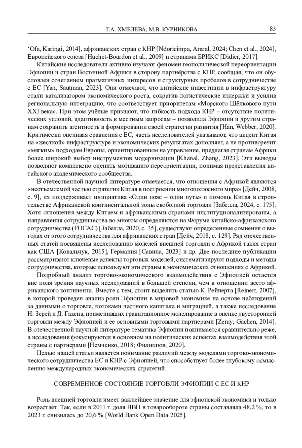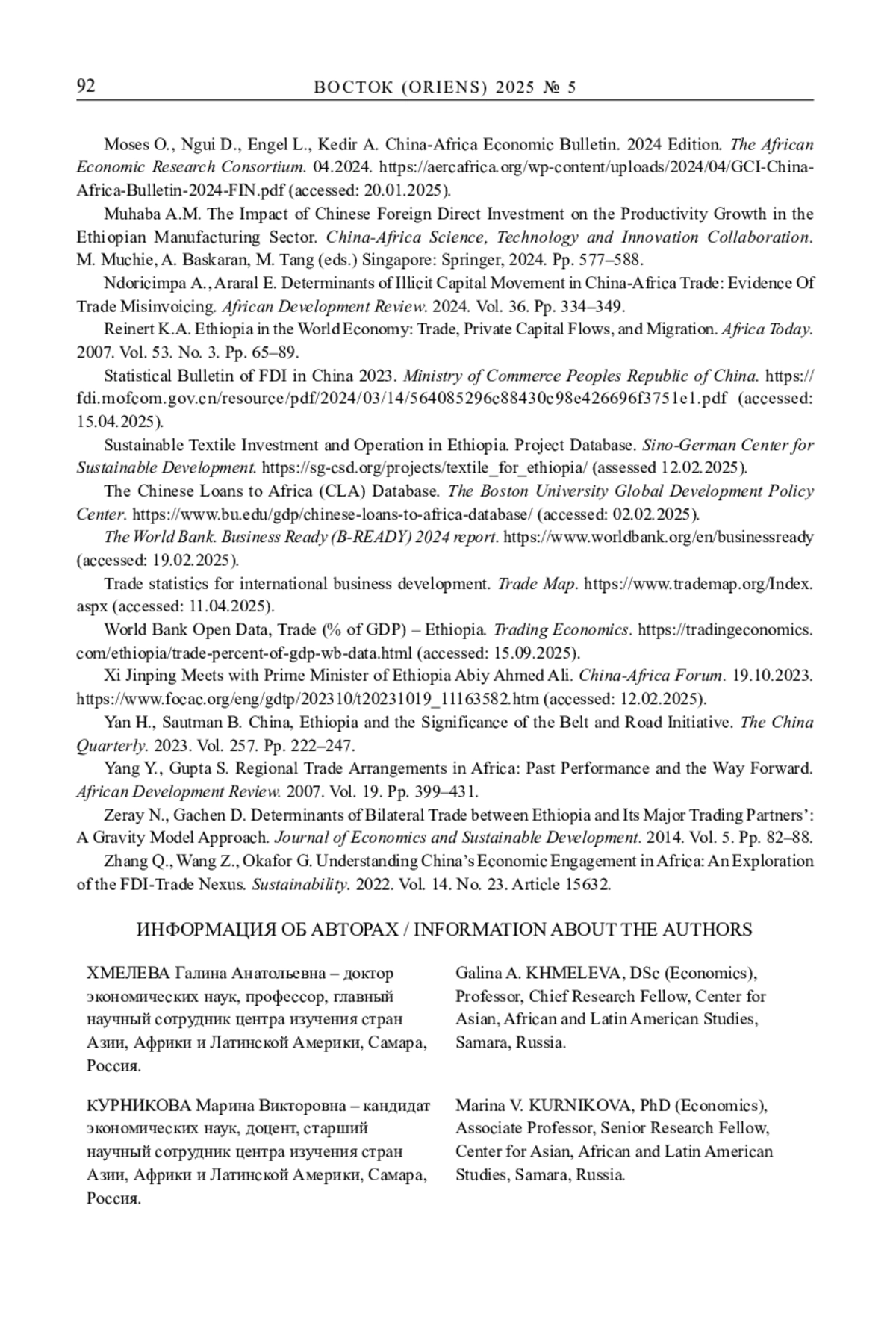 ХМЕЛЕВА Г. А., КУРНИКОВА М. В. В ТЕНИ «ПОЯСА И ПУТИ»: ЭФИОПИЯ МЕЖДУ КИТАЙСКИМИ ИНВЕСТИЦИЯМИ И ЕВРОПЕЙСКИМ ВЛИЯНИЕМ1 // ВОСТОК. АФРО-АЗИАТСКИЕ ОБЩЕСТВА: ИСТОРИЯ И СОВРЕМЕННОСТЬ. 2025. № 5