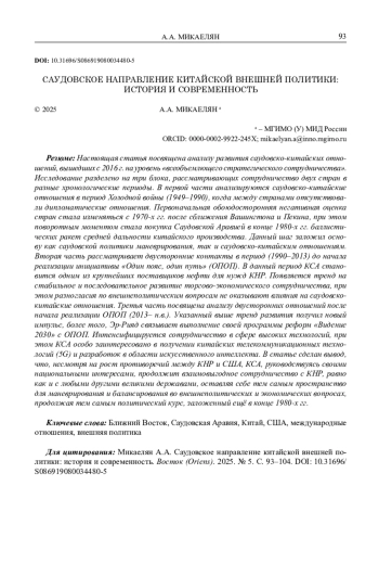 Н астоящая статья посвящена анализу развития саудовско-китайских отношений, вышедших с 2016 г. на уровень «всеобъемлющего стратегического сотрудничества». Исследование разделено на три блока, рассматривающих сотрудничество двух стран в разные хронологические периоды. В первой части анализируются саудовско-китайские отношения в период Холодной войны (1949–1990), когда между странами отсутствовали дипломатические отношения. Первоначальная обоюдосторонняя негативная оценка стран стала изменяться с 1970-х гг. после сближения Вашингтона и Пекина, при этом поворотным моментом стала покупка Саудовской Аравией в конце 1980-х гг. баллистических ракет средней дальности китайского производства. Данный шаг заложил основу как саудовской политики маневрирования, так и саудовско-китайским отношениям. Вторая часть рассматривает двусторонние контакты в период (1990–2013) до начала реализации инициативы «Один пояс, один путь» (ОПОП). В данный период КСА становится одним из крупнейших поставщиков нефти для нужд КНР. Появляется тренд на стабильное и последовательное развитие торгово-экономического сотрудничества, при этом разногласия по внешнеполитическим вопросам не оказывают влияния на саудовскокитайские отношения. Третья часть посвящена анализу двусторонних отношений после начала реализации ОПОП (2013– н. в.). Указанный выше тренд развития получил новый импульс, более того, Эр-Рияд связывает выполнение своей программы реформ «Видение 2030» с ОПОП. Интенсифицируется сотрудничество в сфере высоких технологий, при этом КСА особо заинтересовано в получении китайских телекоммуникационных технологий (5G) и разработок в области искусственного интеллекта. В статье сделан вывод, что, несмотря на рост противоречий между КНР и США, КСА, руководствуясь своими национальными интересами, продолжит взаимовыгодное сотрудничество с КНР, равно как и с любыми другими великими державами, оставляя себе тем самым пространство для маневрирования и балансирования во внешнеполитических и экономических вопросах, продолжая тем самым политический курс, заложенный ещё в конце 1980-х гг.