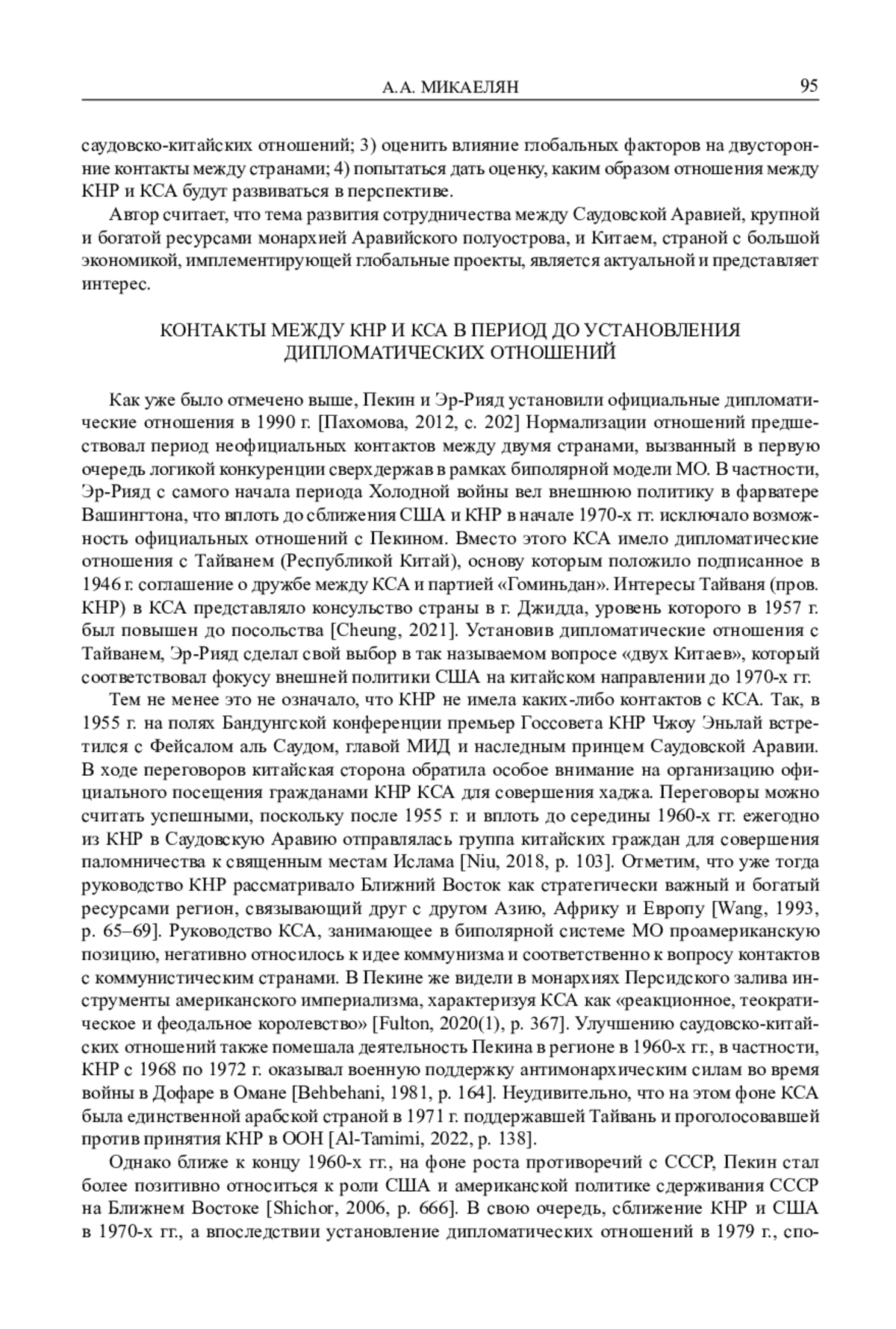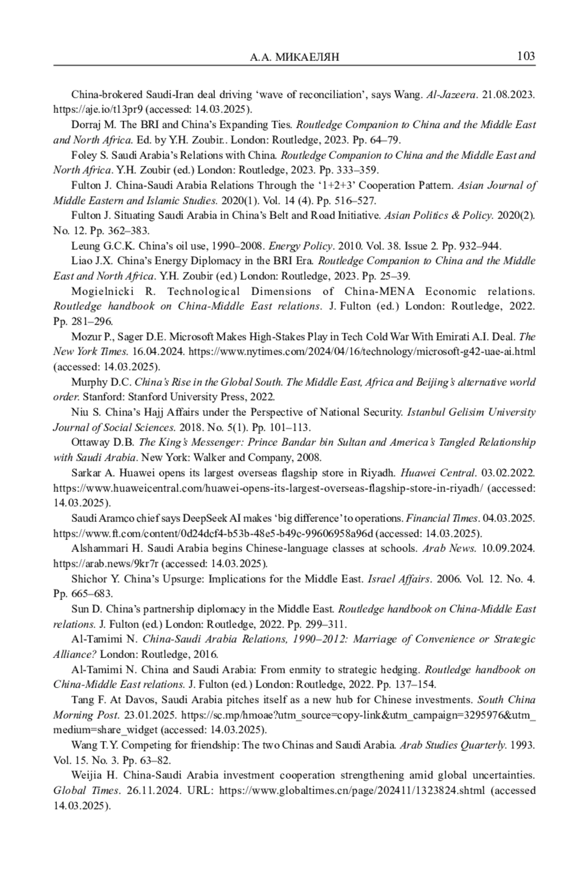 3. Мелкумян Е.С. Саудовская Аравия между США и Китаем в XXI веке: успешное балансирование. Мировая экономика и международные отношения. 2024. 68. № 5. С. 61-71.