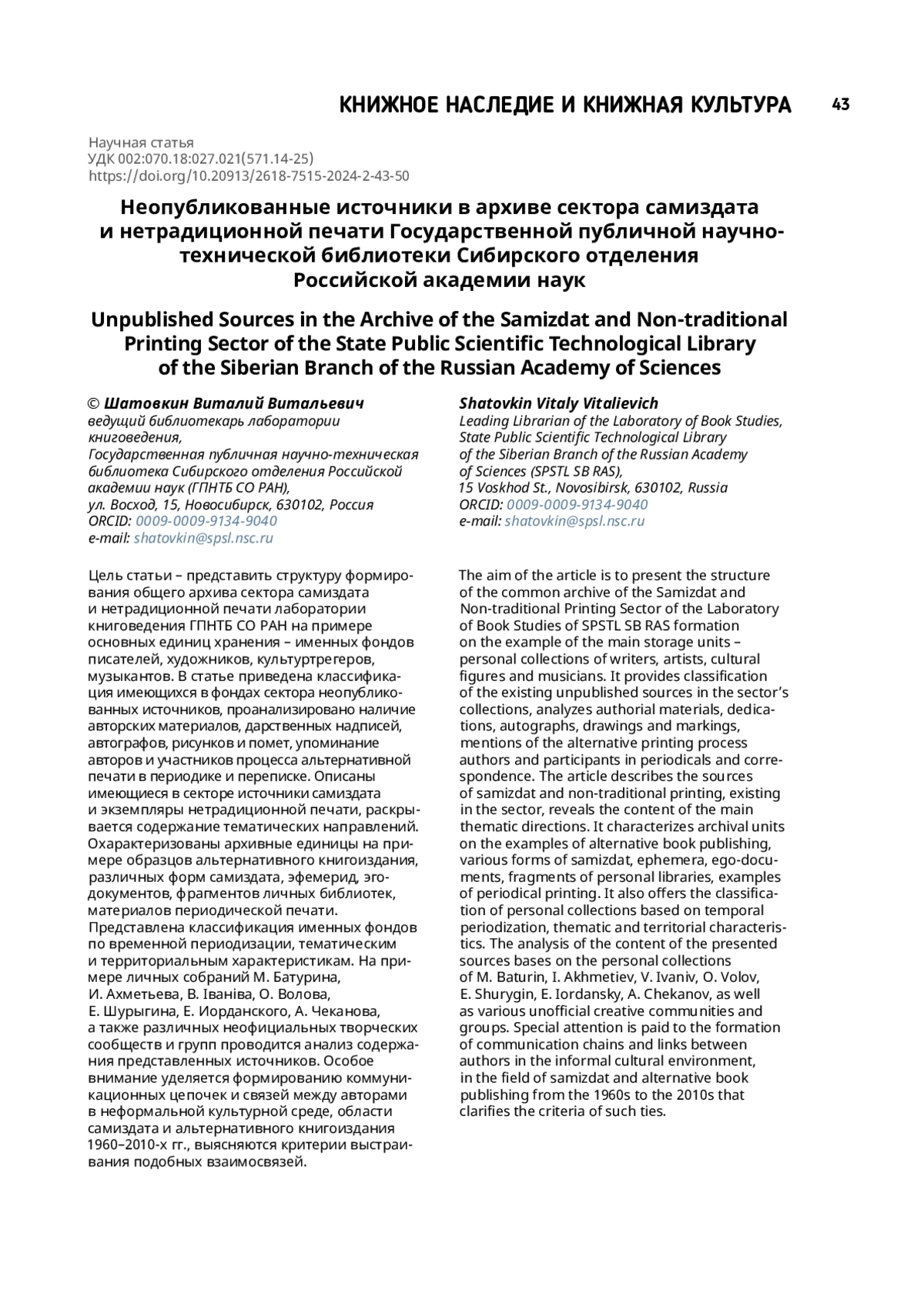 Цель статьи – представить структуру формирования общего архива сектора самиздата и нетрадиционной печати лаборатории книговедения ГПНТБ СО РАН на примере основных единиц хранения – именных фондов писателей, художников, культуртрегеров, музыкантов. В статье приведена классификация имеющихся в фондах сектора неопубликованных источников, проанализировано наличие авторских материалов, дарственных надписей, автографов, рисунков и помет, упоминание авторов и участников процесса альтернативной печати в периодике и переписке. Описаны имеющиеся в секторе источники самиздата и экземпляры нетрадиционной печати, раскрывается содержание тематических направлений. Охарактеризованы архивные единицы на примере образцов альтернативного книгоиздания, различных форм самиздата, эфемерид, эгодокументов, фрагментов личных библиотек, материалов периодической печати. Представлена классификация именных фондов по временной периодизации, тематическим и территориальным характеристикам. На примере личных собраний М. Батурина, И. Ахметьева, В. Iванiва, О. Волова, Е. Шурыгина, Е. Иорданского, А. Чеканова, а также различных неофициальных творческих сообществ и групп проводится анализ содержания представленных источников. Особое внимание уделяется формированию коммуникационных цепочек и связей между авторами в неформальной культурной среде, области самиздата и альтернативного книгоиздания 1960–2010-х гг., выясняются критерии выстраивания подобных взаимосвязей.