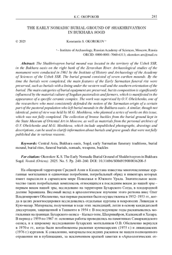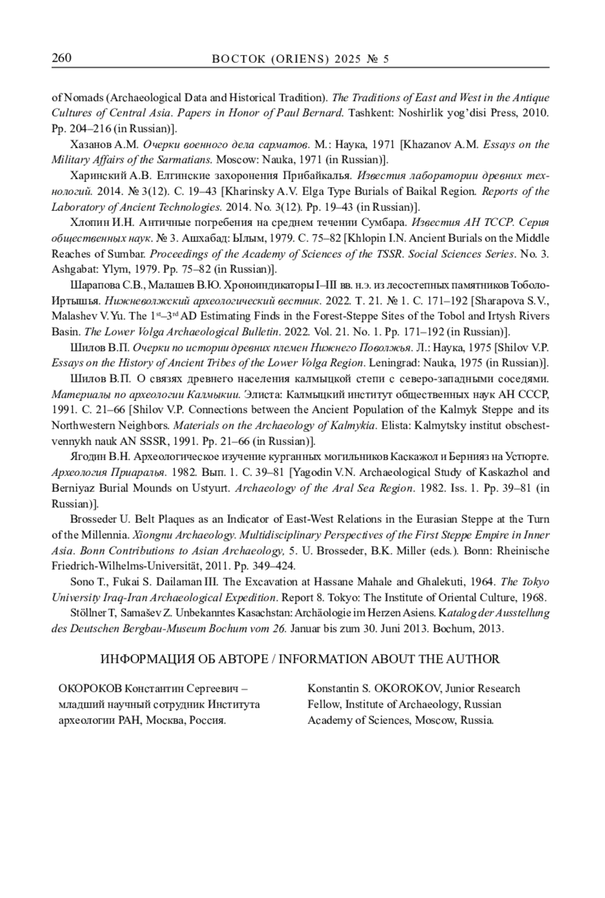 39. Окороков К.С. Новая категория предметов восточного происхождения в сарматских памятниках II-I вв. до н.э. Краткие сообщения института археологии. 2024. Вып. 277. С. 165-174.