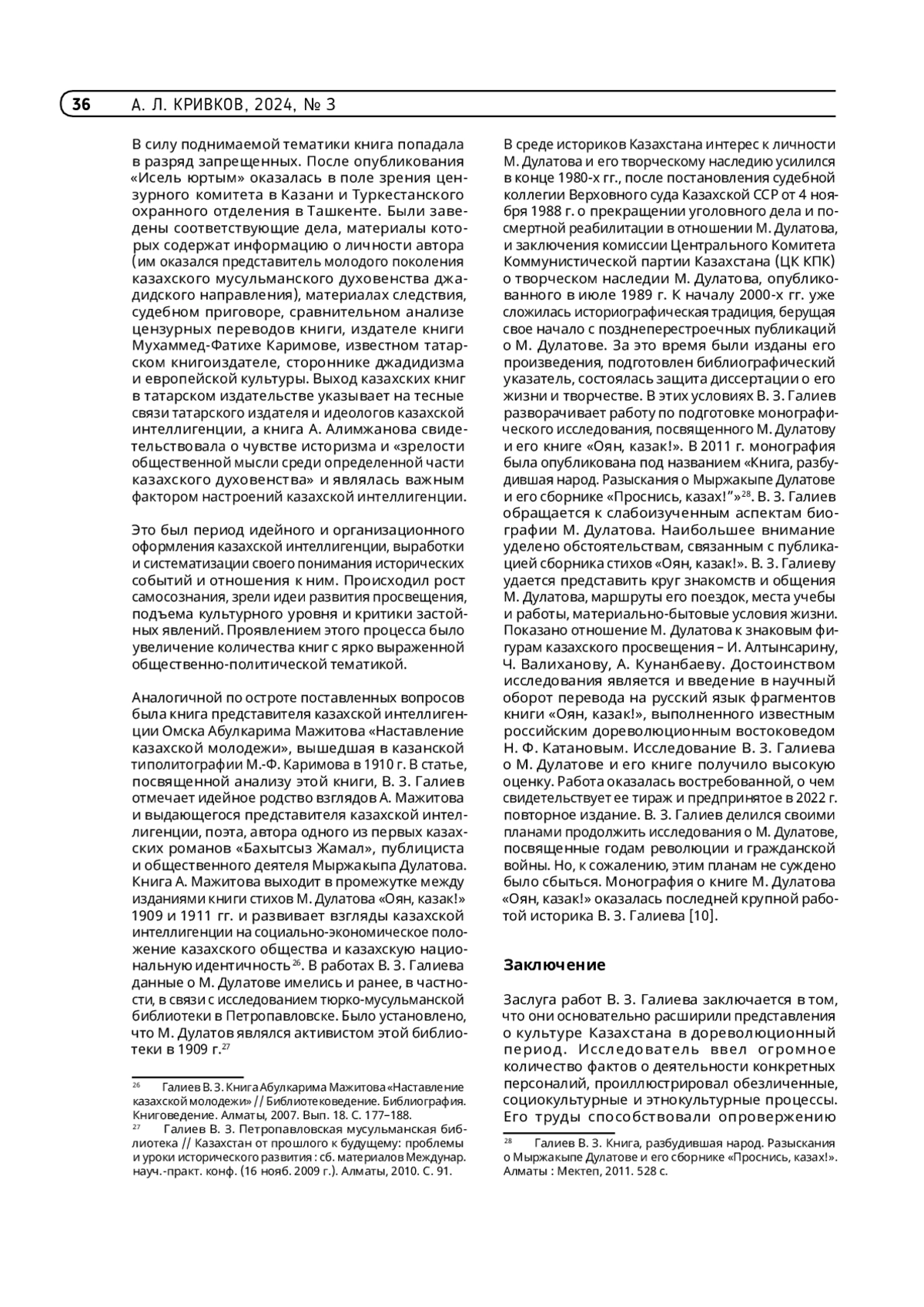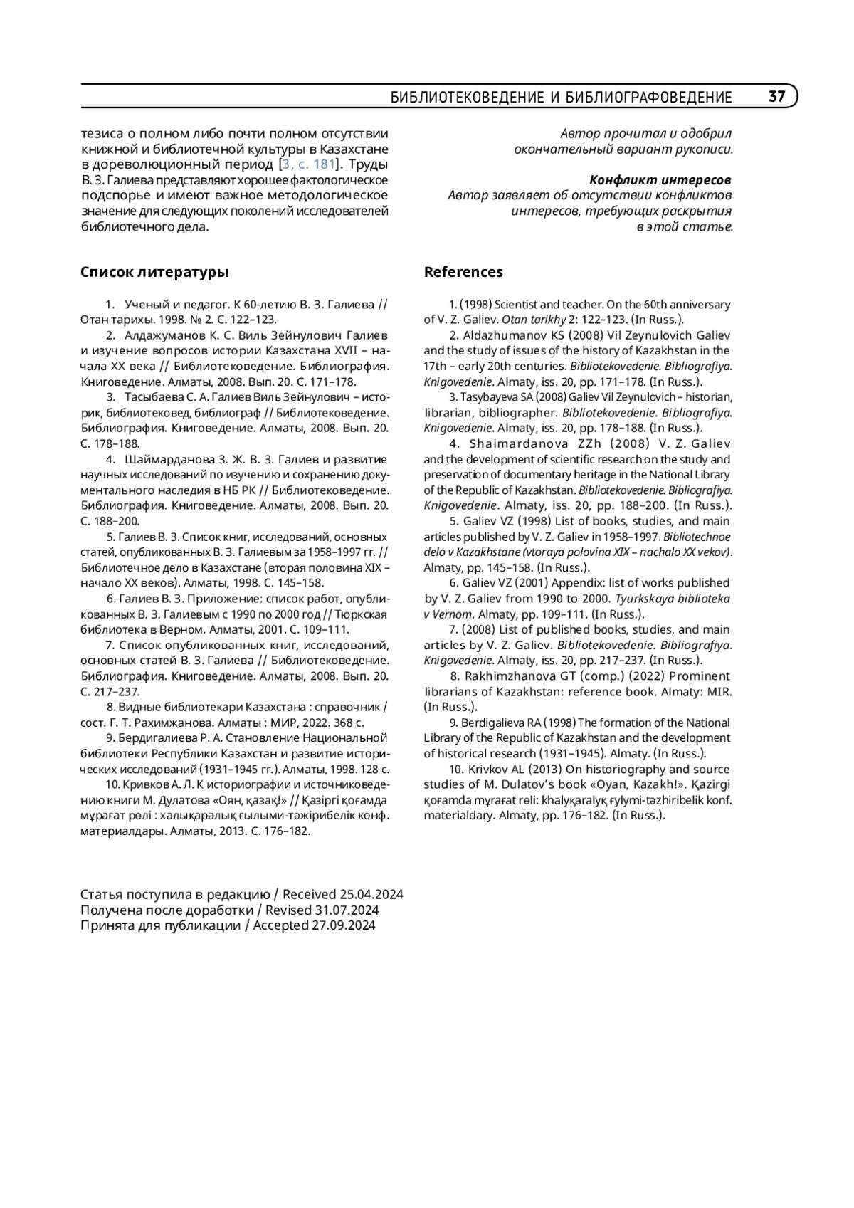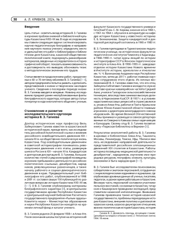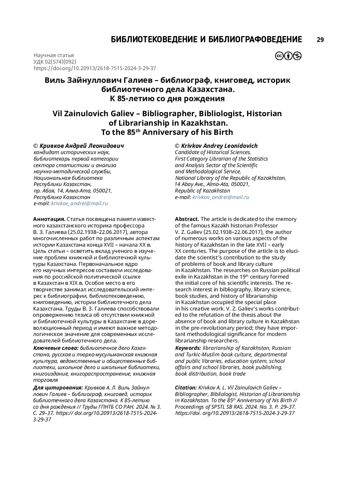 КРИВКОВ А. Л. ВИЛЬ ЗАЙНУЛЛОВИЧ ГАЛИЕВ – БИБЛИОГРАФ, КНИГОВЕД, ИСТОРИК БИБЛИОТЕЧНОГО ДЕЛА КАЗАХСТАНА. К 85-ЛЕТИЮ СО ДНЯ РОЖДЕНИЯ // ТРУДЫ ГПНТБ СО РАН. 2024. № 3