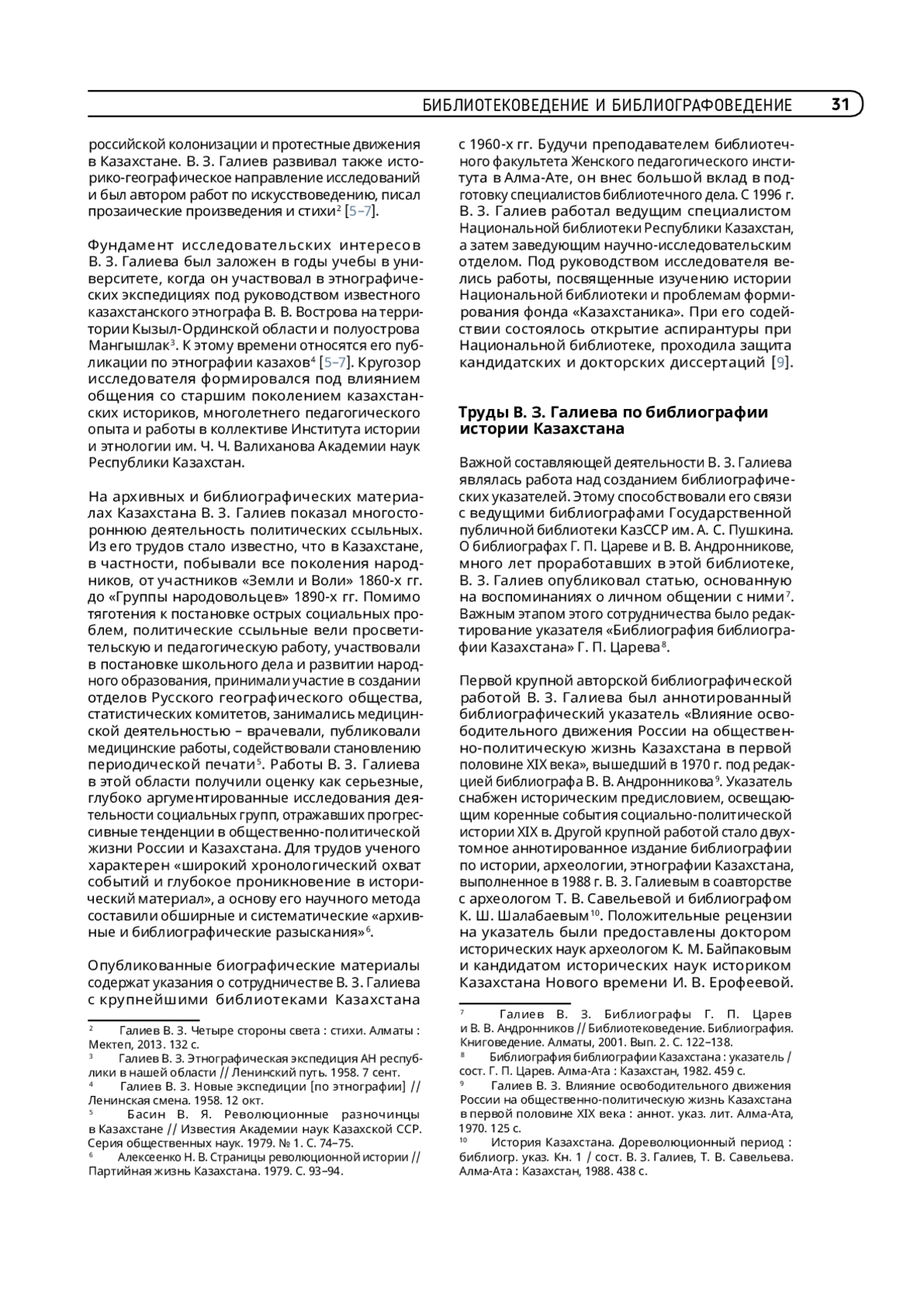 Статья посвящена памяти известного казахстанского историка профессора В. З. Галиева (25.02.1938–22.06.2017), автора многочисленных работ по различным аспектам истории Казахстана конца ХVII – начала ХХ в. Цель статьи – осветить вклад ученого в изучение проблем книжной и библиотечной культуры Казахстана. Первоначальное ядро его научных интересов составили исследования по российской политической ссылке в Казахстан в ХIХ в. Особое место в его творчестве занимал исследовательский интерес к библиографии, библиотековедению, книговедению, истории библиотечного дела Казахстана. Труды В. З. Галиева способствовали опровержению тезиса об отсутствии книжной и библиотечной культуры в Казахстане в дореволюционный период и имеют важное методологическое значение для современных исследователей библиотечного дела.
