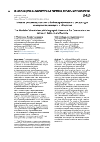 11. Юкляевская А. В. Рекомендательные библиографические ресурсы для продвижения научных знаний на веб-сайтах библиотек России // Библиосфера. 2023. № 1. С. 65-72. https://doi.org/10.20913/1815-3186-2023-1-65-72.