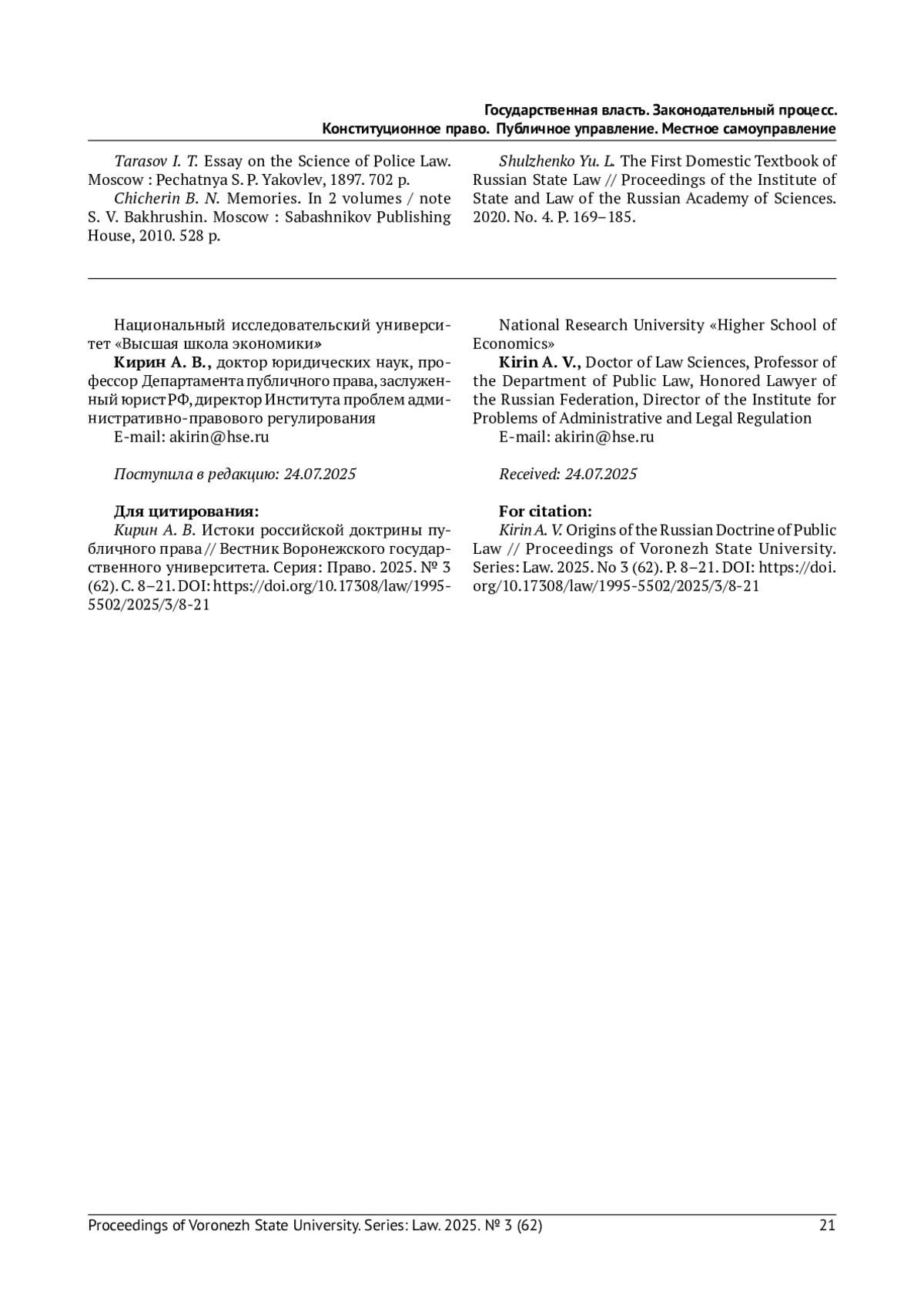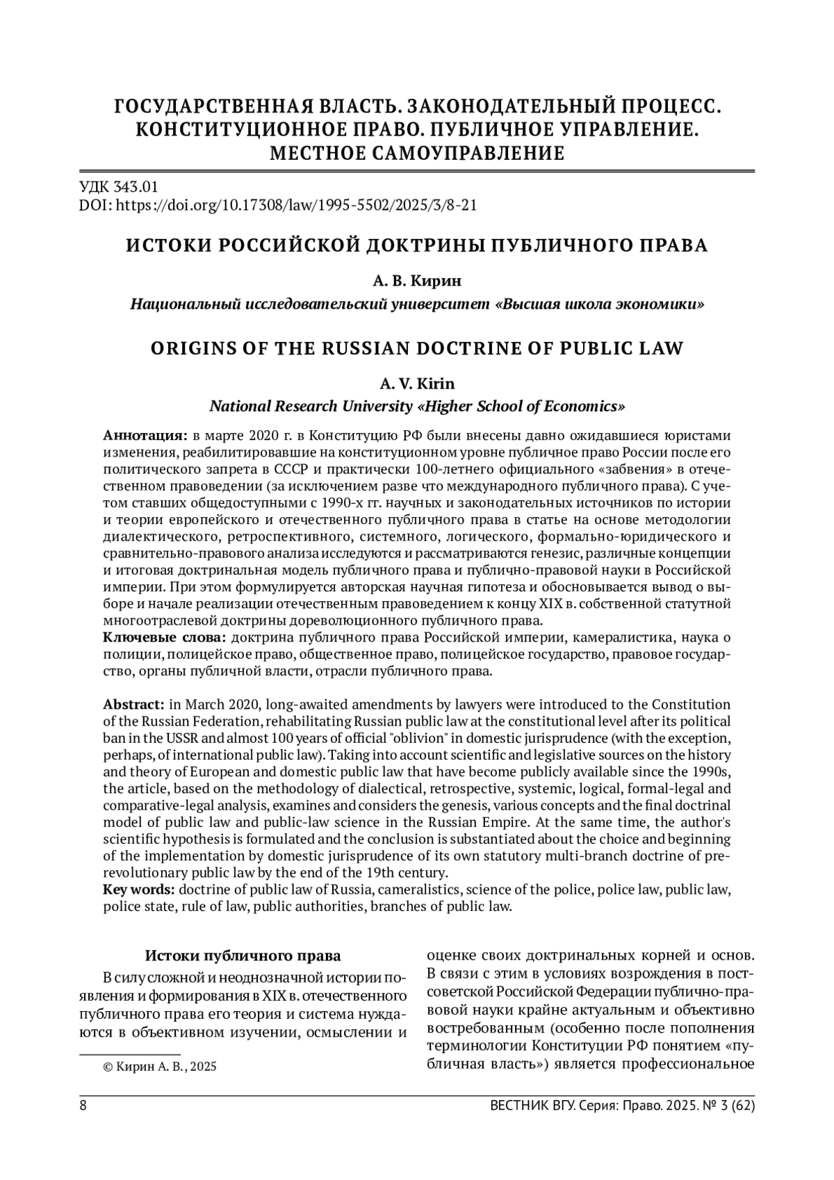15. Публичное право: учебник / В. А. Виноградов,A. О. Гаджиева, А. А. Ларичев [ и др.]; под ред. проф.B. А. Виноградова; Нац. исслед. ун-т “Высшая школа экономики”. М.: Проспект, 2025. Глава 1 (автор - А. В. Кирин). С. 16-38.