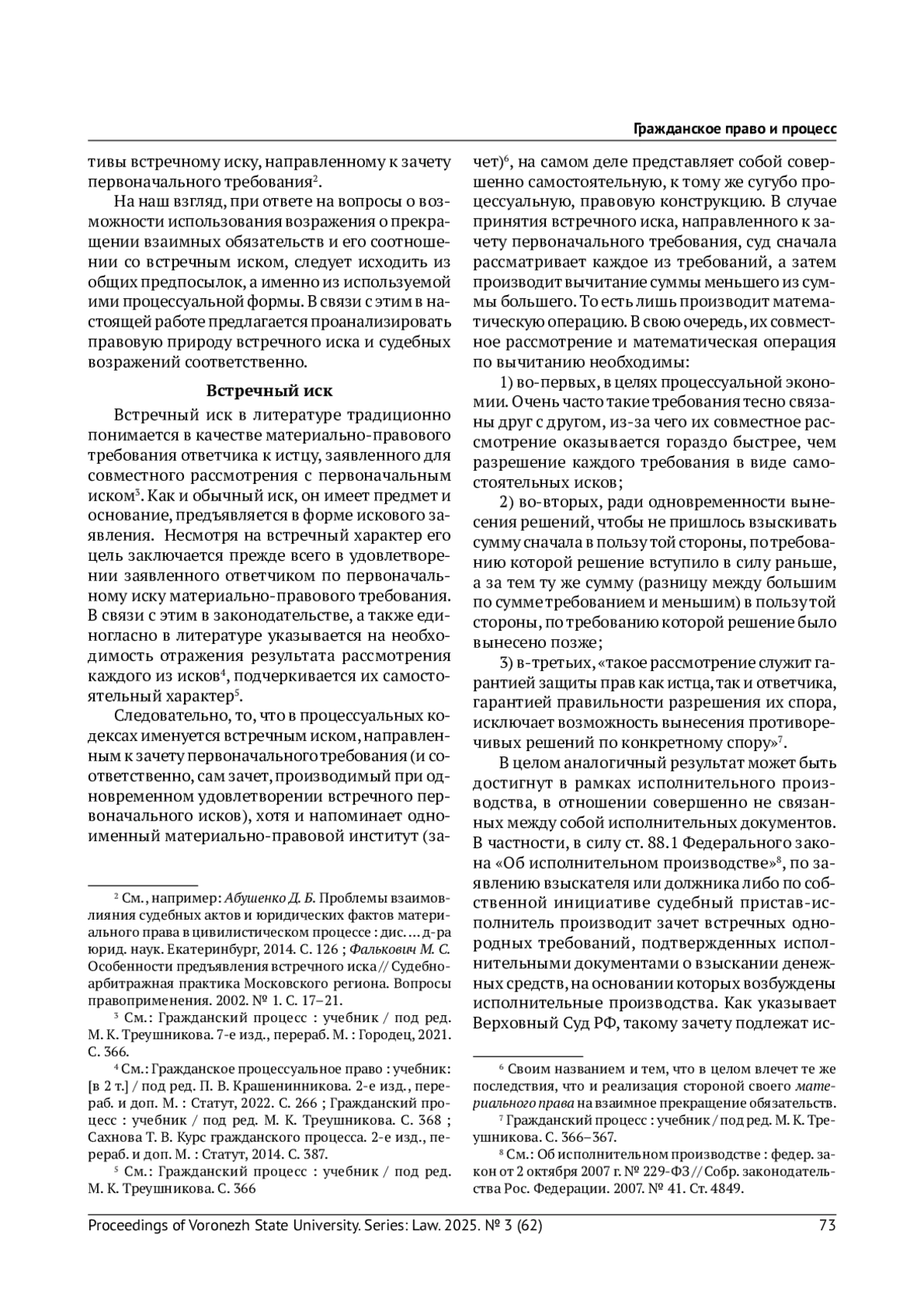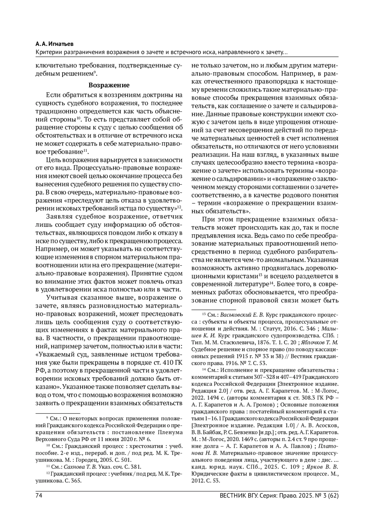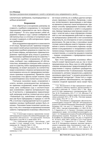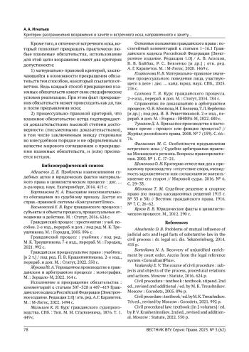 Автор приходит к выводу о том, данные порядки прекращения взаимных обязательств, несмотря на использование термина «зачет», представляют собой сущностно разные правовые конструкции. В отличие от встречного иска, который может быть использован для прекращения потенциально любых взаимных обязательств, использование для этих целей возражения имеет два критерия допустимости: 1) материально-правовой критерий, заключающийся в возможности прекращения обязательств тем способом, на который ссылается ответчик; 2) процессуально-правовой критерий, предполагающий бесспорность взаимного обязательства истца.