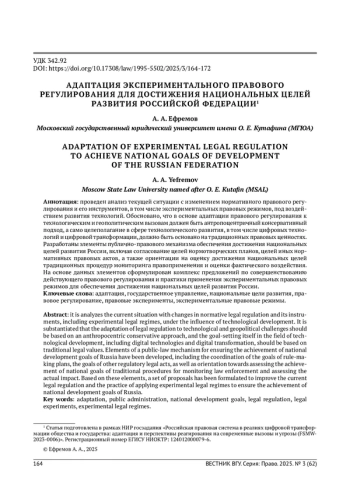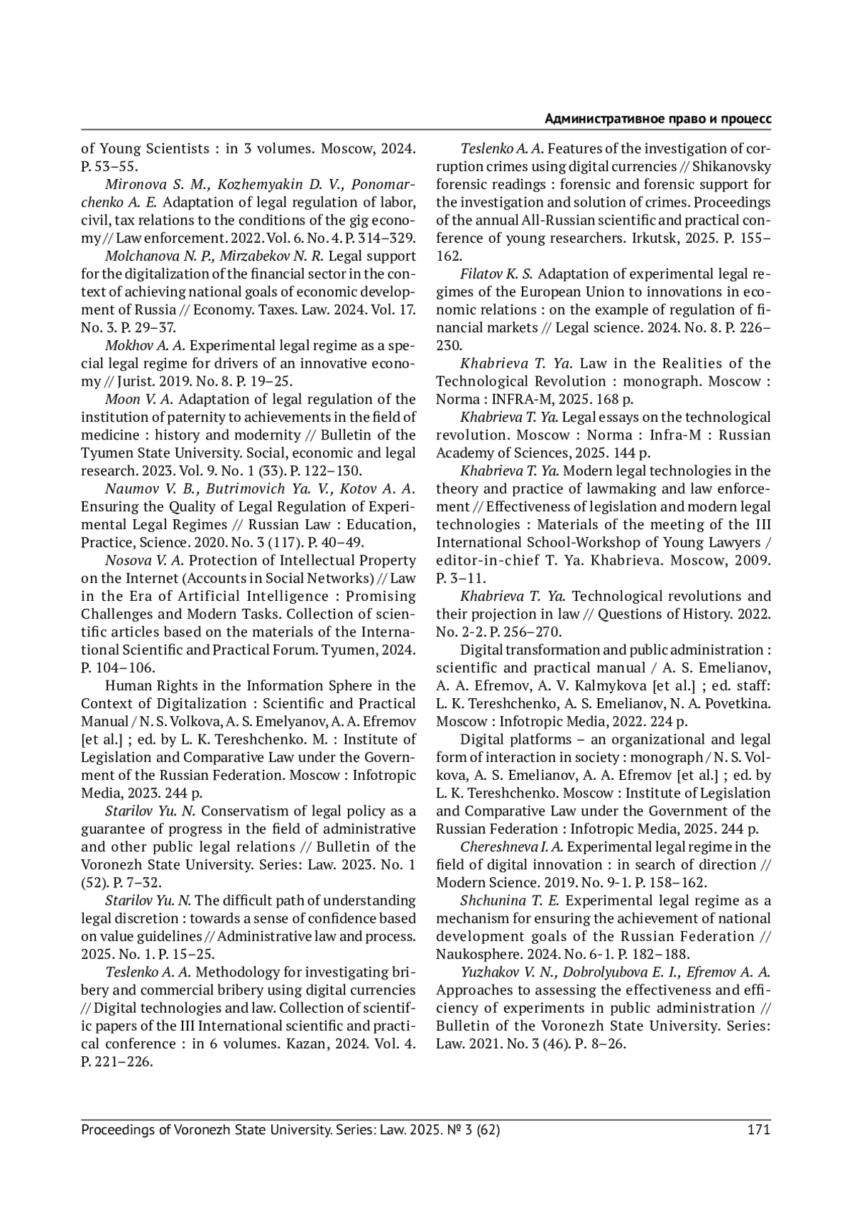 7. Ефремов А. А. Перспективы развития экспериментального правового регулирования в сфере цифровых и технологических инноваций // Вестник Университета имени О. Е. Кутафина (МГЮА).2024. № 10. С. 133-140. EDN: JGXFNY