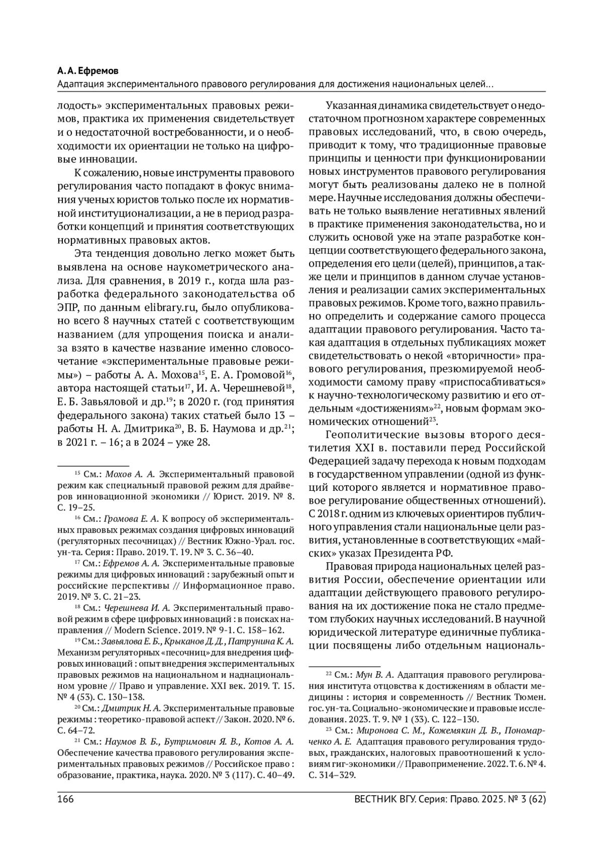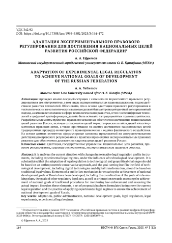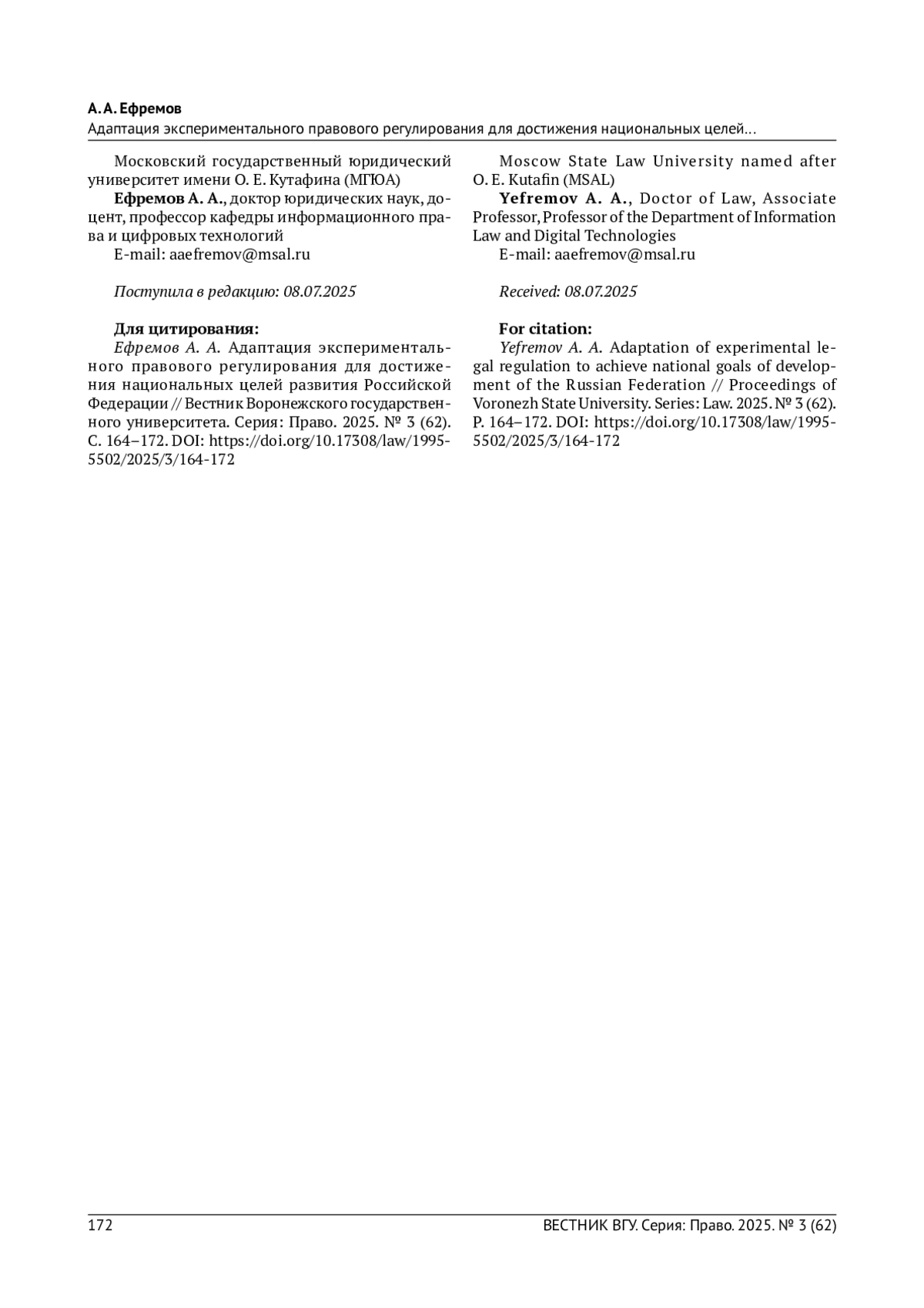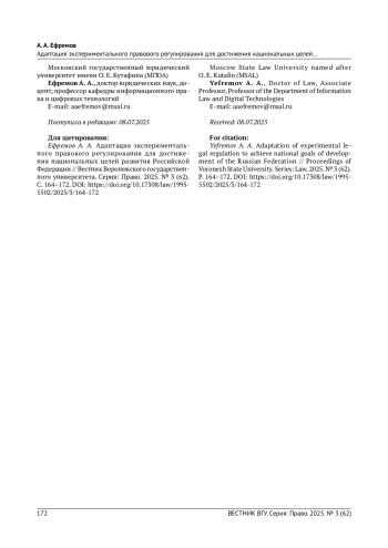 6. Ефремов А. А. Государственный доклад о реализации экспериментальных правовых режимов как инструмент оценки эффективности экспериментального регулирования // Юридическая техника. 2025. № 19. С. 167-169. EDN: ZATWAH