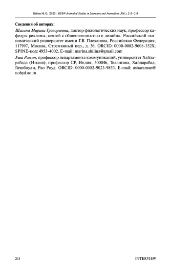 Shilina M. G. Mediatized popular culture in contemporary India: multipolar and multilayered reflections in everyday life: interview with Prof. Usha Raman // Вестник Российского университета дружбы народов. Серия: Литературоведение. Журналистика. 2025. Т. 30. № 1. С. 213–218. http://doi. org/10.22363/2312-9220-2025 30-1-213-218