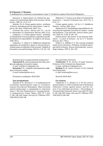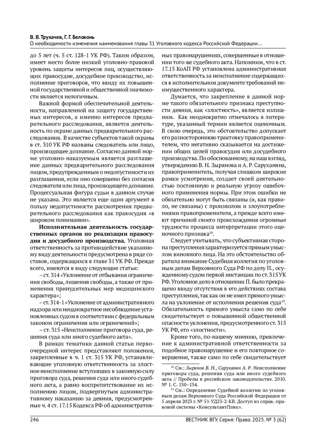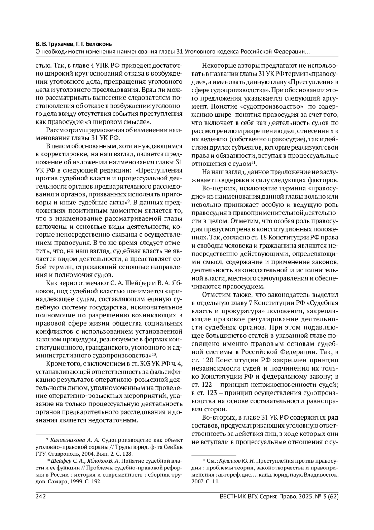 ТРУХАЧЕВ В.В., БЕЛОКОНЬ Г.Г. О НЕОБХОДИМОСТИ ИЗМЕНЕНИЯ НАИМЕНОВАНИЯ ГЛАВЫ 31 УГОЛОВНОГО КОДЕКСА РОССИЙСКОЙ ФЕДЕРАЦИИ «ПРЕСТУПЛЕНИЯ ПРОТИВ ПРАВОСУДИЯ» И СОДЕРЖАНИЯ ЕЕ ОТДЕЛЬНЫХ НОРМ // ВЕСТНИК ВОРОНЕЖСКОГО ГОСУДАРСТВЕННОГО УНИВЕРСИТЕТА. СЕРИЯ: ПРАВО. 2025. № 3 (62)
