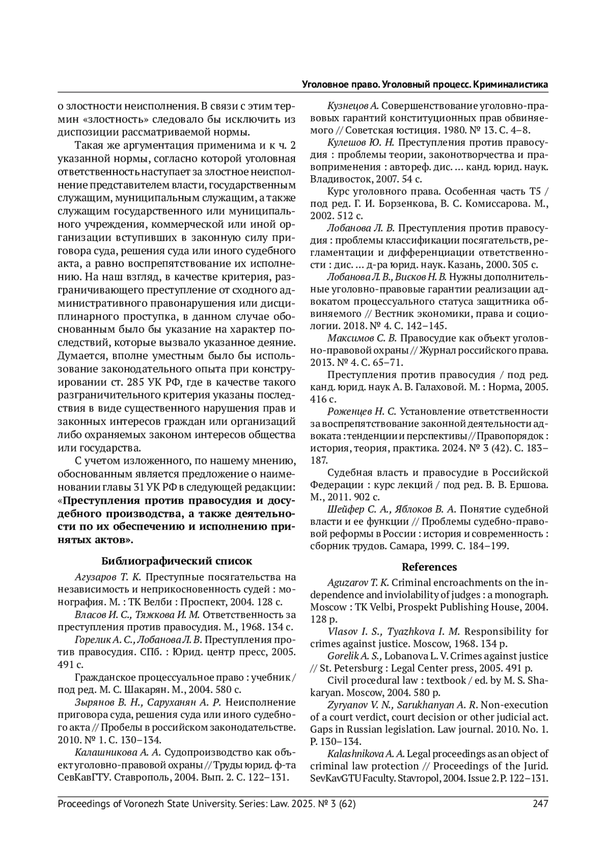 Статья: О НЕОБХОДИМОСТИ ИЗМЕНЕНИЯ НАИМЕНОВАНИЯ ГЛАВЫ 31 УГОЛОВНОГО КОДЕКСА РОССИЙСКОЙ ФЕДЕРАЦИИ «ПРЕСТУПЛЕНИЯ ПРОТИВ ПРАВОСУДИЯ» И СОДЕРЖАНИЯ ЕЕ ОТДЕЛЬНЫХ НОРМ (2025)