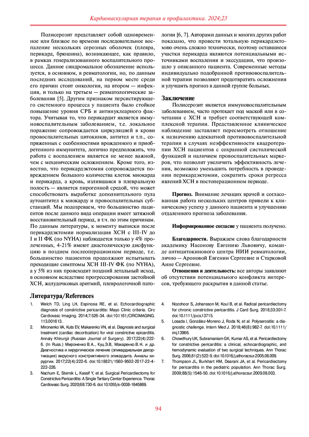 Заключение. Особенность течения перикардита в данном клиническом случае заключается в быстро прогрессирующем нарастании с весьма скудными проявлениями воспалительной реакции, прогрессировании при повторной стимуляции антигенами вирусов, быстрым развитием констрикции без значимого утолщения листков перикарда. Сохраняющийся полисерозит может быть причиной резистентного к терапии ОАС у пациентов после перикардэктомии. Следует учитывать возможность наличия торпидного воспаления у пациентов с ОАС.
