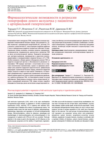 Гипертрофия левого желудочка (ГЛЖ), являющаяся основным проявлением гипертензивной болезни сердца, регистрируется у 15- 45% пациентов с артериальной гипертензией (АГ), достигая 77% у больных с резистентной АГ, сопутствующим сахарным диабетом 2 типа и перенесенным сердечно-сосудистым событием. В представленном обзоре изложены основные вопросы определения, патофизиологии, эпидемиологии, диагностики и регрессии ГЛЖ на фоне антигипертензивной терапии. Приводятся рекомендации, критерии выявления, преимущества и недостатки электрокардиографии и эхокардиографии в ведении больных с АГ и ГЛЖ. Особое внимание в обзоре уделено обсуждению влияния ГЛЖ на сердечно-сосудистый прогноз и обоснованности регрессии гипертрофии. ГЛЖ нередко протекает с отсутствием или со стертыми клиническими проявлениями, однако со временем увеличивает риск развития сердечной недостаточности, фибрилляции предсердий, ишемической болезни сердца, внезапной сердечной смерти, инсульта и смерти от всех причин. Отмечается, что благодаря своевременному и адекватному применению антигипертензивной терапии удается не только снизить артериальное давление, но и добиться регрессии ГЛЖ, что благоприятно влияет на исход заболевания. Представлены основные группы лекарственной терапии, вызывающей регрессию ГЛЖ, среди которых подробно обсуждаются блокаторы ренин-ангиотензинальдостероновой системы (ингибиторы ангиотензинпревращающего фермента, блокаторы рецепторов ангиотензина II, включая в комбинации с ингибитором неприлизина), β-адреноблокаторы, блокаторы кальциевых каналов, ингибиторы натрий-глюкозного котранспортера 2 типа и диуретики.