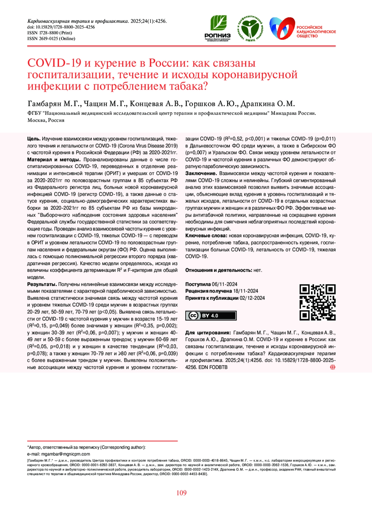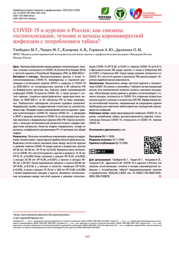 Заключение. Взаимосвязи между частотой курения и показателями COVID-19 сложны и нелинейны. Глубокий сегментированный анализ этих взаимосвязей позволил выявить значимые ассоциации, объясняющие вклад курения в уровень госпитализаций и тяжелых исходов, летальности от COVID-19 в отдельных возрастных группах мужчин и женщин и в различных ФО РФ. Эффективные меры антитабачной политики, направленные на сокращение курения необходимы для смягчения неблагоприятных последствий коронавирусных инфекций.