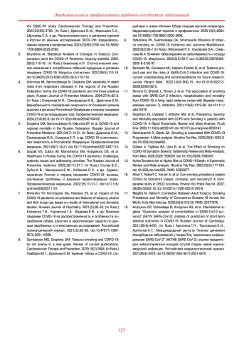 8. Гамбарян М. Г., Драпкина О. М. Курение табака и COVID-19: старый враг в новом обличии. Обзор текущей научной литературы. Кардиоваскулярная терапия и профилактика. 2020;19(3):2604. DOI: 10.15829/1728-8800-2020-2604