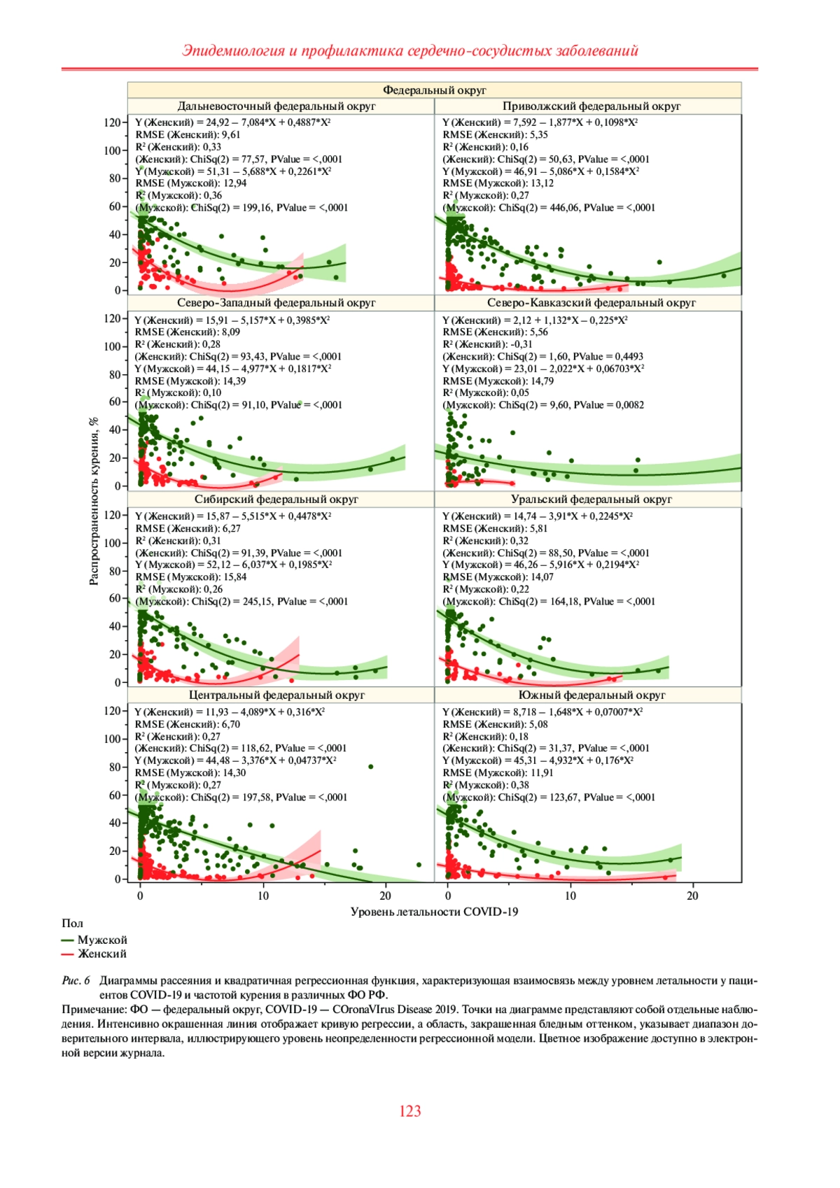 Результаты. Получены нелинейные взаимосвязи между исследуемыми показателями с характерной параболической зависимостью. Выявлена статистически значимая связь между частотой курения и уровнем тяжелых COVID-19 среди мужчин в возрастных группах 20-29 лет, 50-59 лет, 70-79 лет (p<0,05). Выявлена связь летальности от COVID-19 с частотой курения у мужчин в возрасте 15-19 лет (R2=0,15, p=0,049) более значимая у женщин (R2=0,35, p=0,002); у женщин 30-39 лет (R2=0,06, p=0,007); у мужчин и женщин 40- 49 лет и 50-59 с более выраженным трендом; у мужчин 60-69 лет (R2=0,05, p=0,018) и у женщин в качестве тенденции (R2=0,03, p=0,078); а также у женщин 70-79 лет и ≥80 лет (R2=0,06, p=0,039) с более выраженным трендом у мужчин. Выявлены положительные ассоциации между частотой курения и уровнем госпитализации COVID-19 (R2=0,52, p<0,001) и тяжелых COVID-19 (p=0,011) в Дальневосточном ФО среди мужчин, а также в Сибирском ФО (p=0,007) и Уральском ФО. Связи между уровнем летальности от COVID-19 и частотой курения в различных ФО демонстрируют обратную параболическую зависимость.