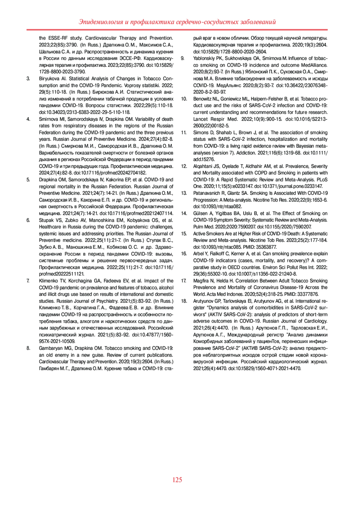2. Драпкина О. М., Максимов С. А., Шальнова С. А. и др. Распространенность и динамика курения в России по данным исследования ЭССЕ-РФ. Кардиоваскулярная терапия и профилактика. 2023;22(8S):3790. DOI: 10.15829/1728-8800-2023-3790