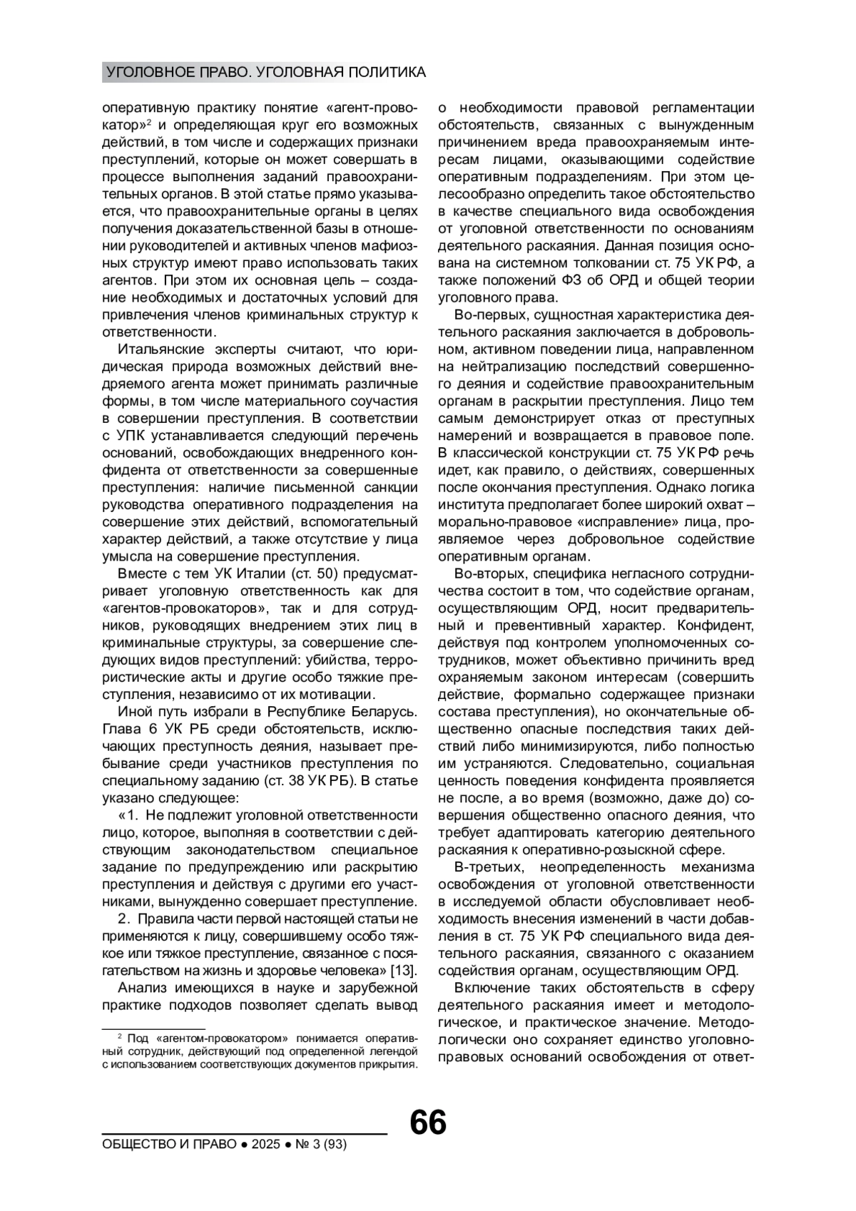 Современная уголовно-правовая политика Российской Федерации ориентируется на использование стимулирующих норм, побуждающих участников преступной деятельности к добровольному отказу от продолжения преступного поведения и к сотрудничеству с государством. Наглядным проявлением указанной тенденции является реализация института освобождения от уголовной ответственности лиц, оказывающих содействие органам, осуществляющим оперативно розыскную деятельность (далее – ОРД). Правовая природа имеющегося в области ОРД механизма освобождения от ответственности таких лиц характеризуется двойственностью.
