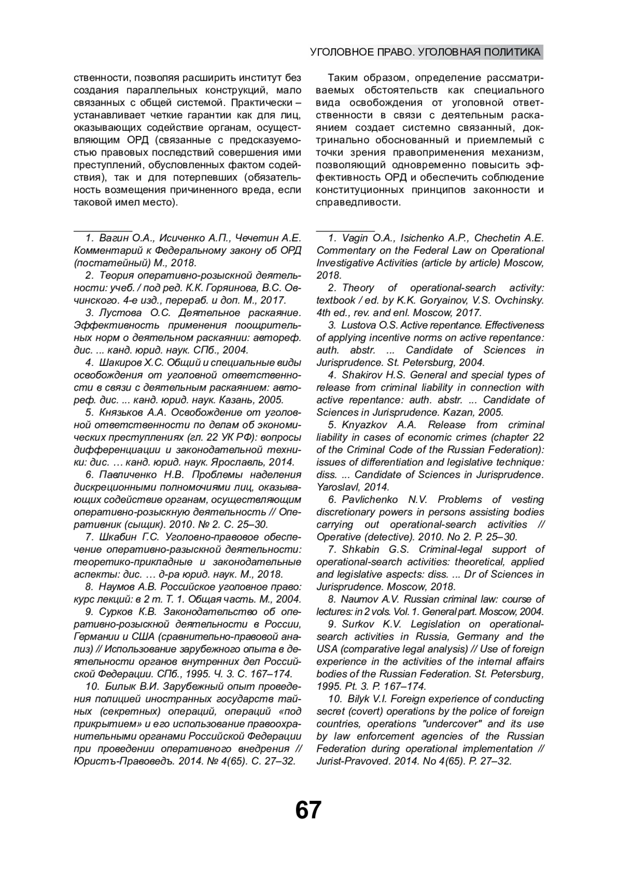 1. Вагин О.А., Исиченко А.П., Чечетин А.Е. Комментарий к Федеральному закону об ОРД (постатейный) М., 2018. EDN: ZDKTGX